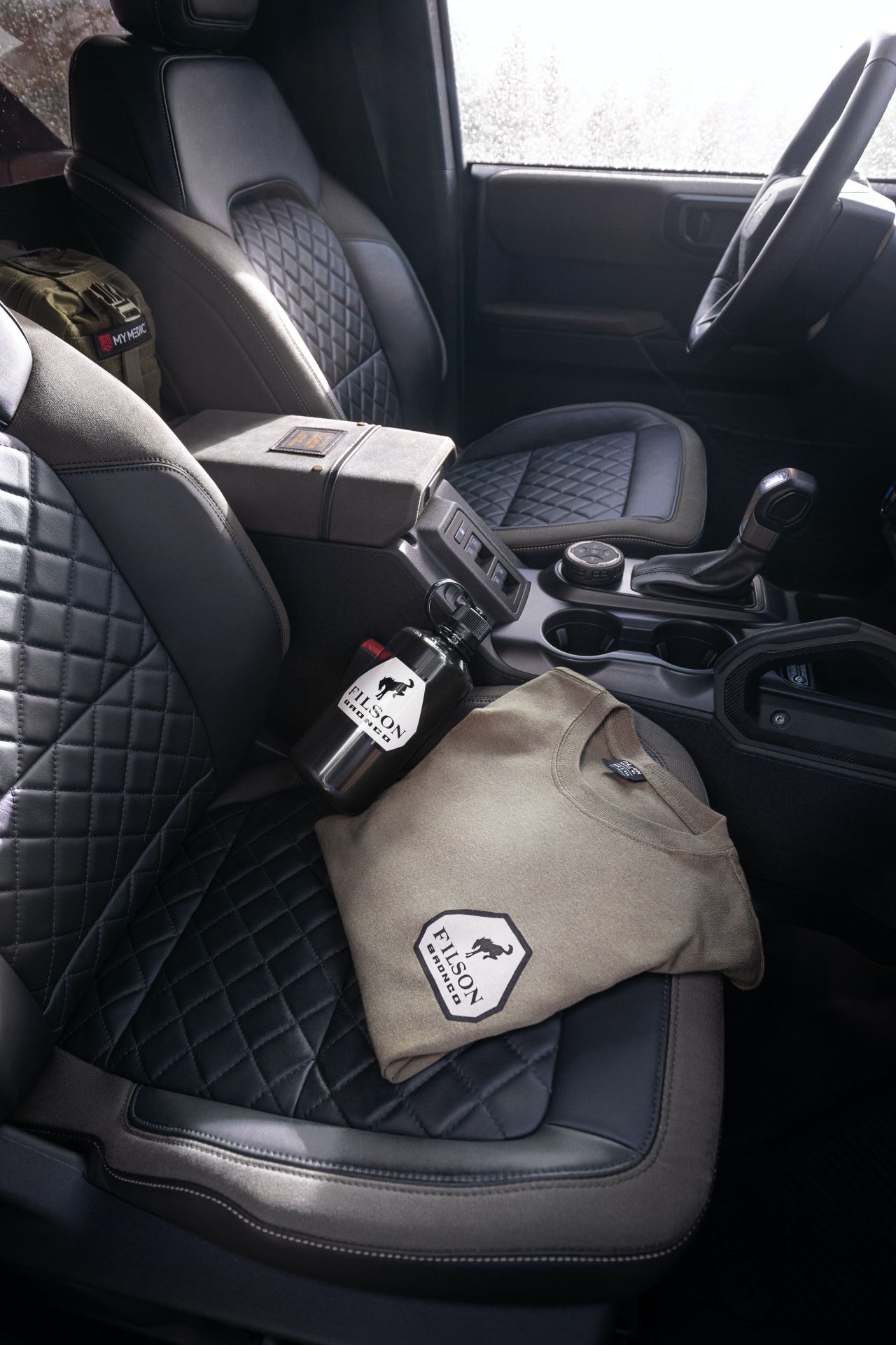 Inside, the Bronco + Filson Wildland Fire Rig features signature Filson materials like the tough otter green duck canvas used on the door bolsters, armrests and seat trim surrounds, the seating surfaces in quilted black leather inspired by Filson’s jacket lining with embossed Bronco logo, and Filson otter green painted grab handles on the instrument panel and center console.