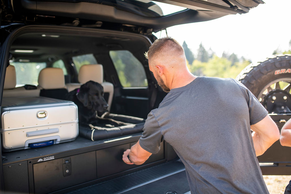 At the front, there’s a CBI Offroad bumper fitted with a winch and 30-inch (762-mm) light bar from Rigid Industries. The rear bumper also comes from CBI Offroad and is equipped with a ladder, dual swing-outs, spare tire, Baja Designs S2 Sport Lighting, and Scepter 5-gallon water cans.