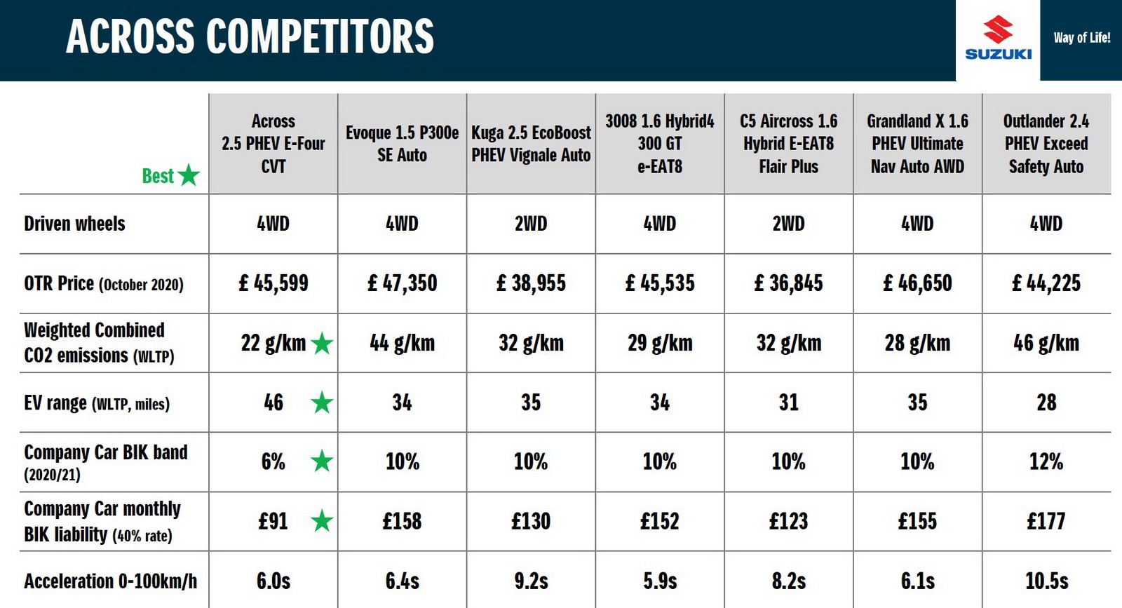 Based on these numbers, the Suzuki Across emits fewer g/km of CO2, has a better EV range and is just as fast as its quickest rival to 62 mph.