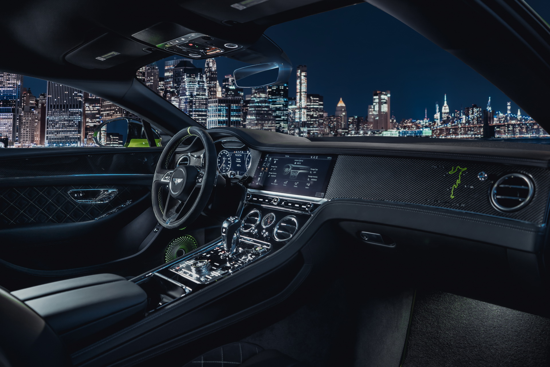 The Pikes Peak Continental GT features eye-catching details like the Acid Green brake calipers, a carbon fiber body kit, a gloss black roof panel with matching wing mirrors, and exclusive Radium paintwork by Mulliner.