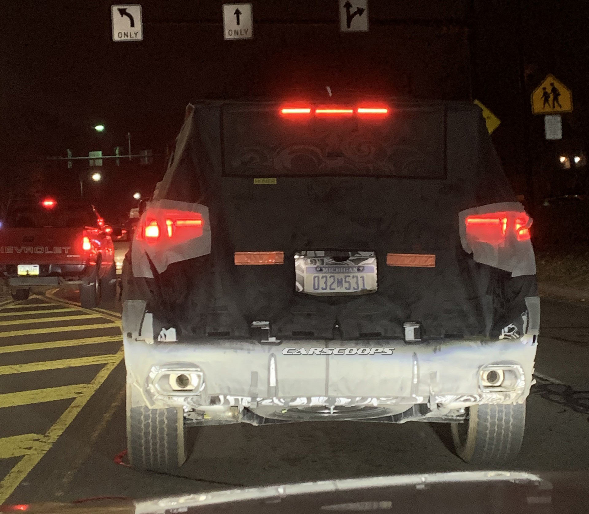 We can see an underbody spare tire and three-dimensional taillights peeking through the camouflage.