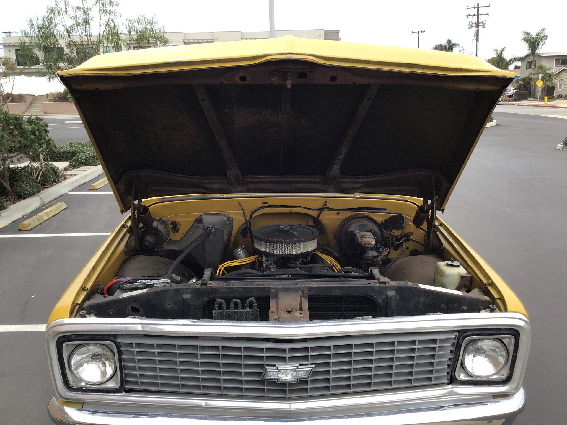 Under the hood lies what appears to be a replacement 350-cubic inch V8 engine, which has been given an aftermarket Chevrolet-branded air filter and valve covers. According to the VIN and the Service Data placard, the truck’s original engine should’ve been an LS9 350-cubic inch V8, so it seems to be a fitting swap. The seller does note that it could be time for an engine rebuild, though, as it’s emitting some blue smoke from the exhaust pipe. Mounted to that engine is a TH350 three-speed automatic transmission, which the seller describes as shifting “good through all the gears” with no unusual noises.