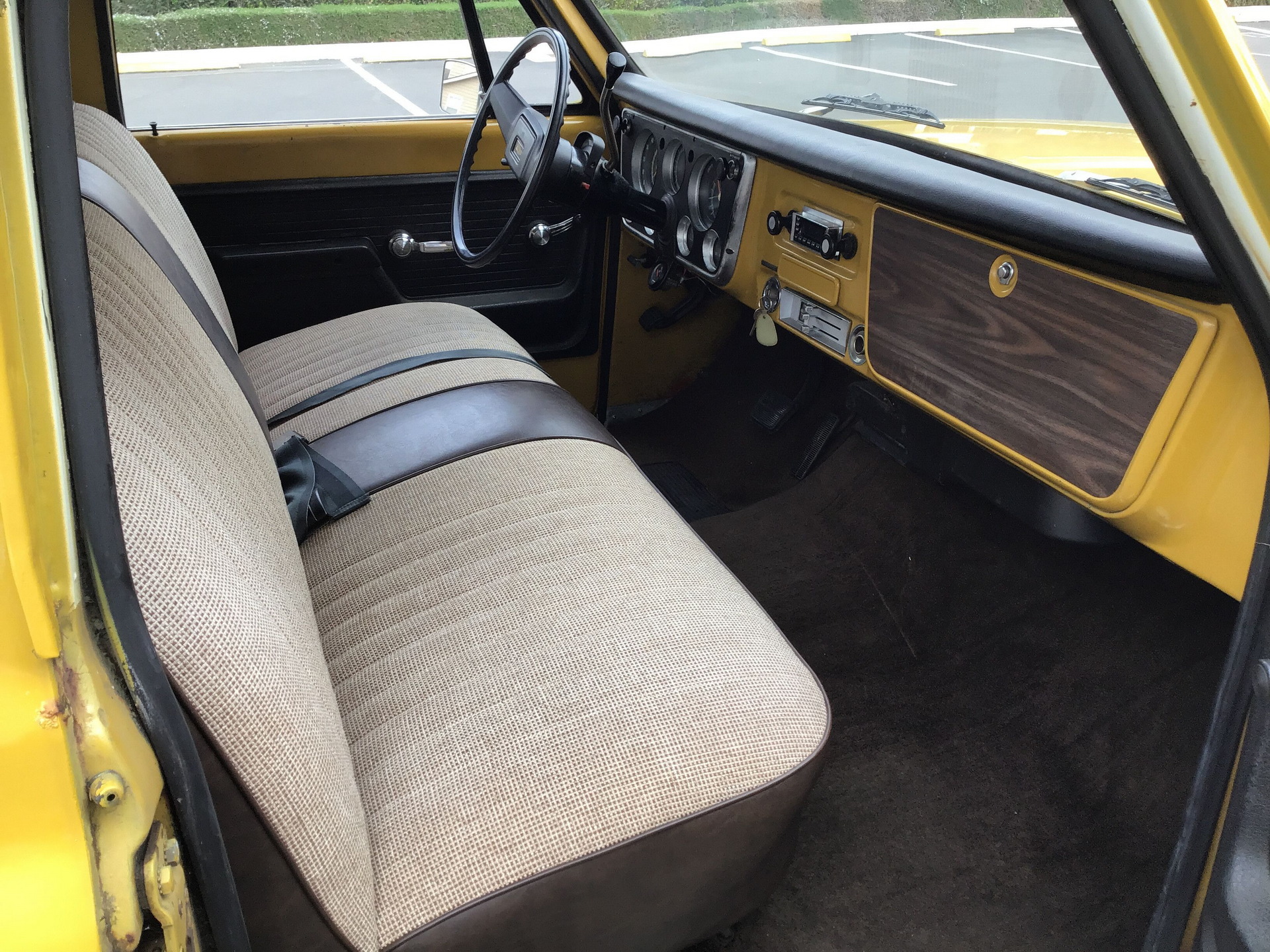 Finally, moving on to the interior, the original black vinyl seats were reupholstered in a blend of vinyl and tweed. The seats themselves are all in good condition, with only the driver’s side suffering a bit of wear on the shoulder area. The interior’s metal parts are all color-matched to the exterior, and the floor has brown carpeting that appears to be free of damage. There is a new AM radio, however it was not connected at the time of sale. The truck has the Z53 gauge package that includes gauges for amps, temperature, and oil pressure. An auxiliary amp gauge was added, since the original one was not functional.