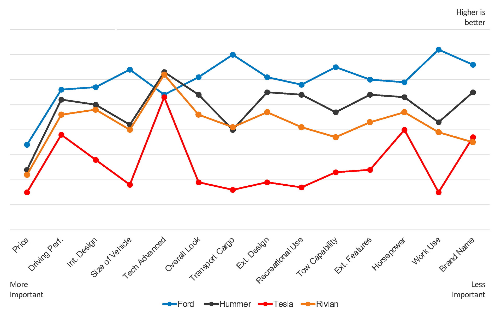 Indeed, when Cox Automotive ranked each attribute of each truck, the Rivian’s weakest attribute is its brand name. For Ford, though, there was just one attribute in which is ranked lower than the rest of the brands: advanced tech.