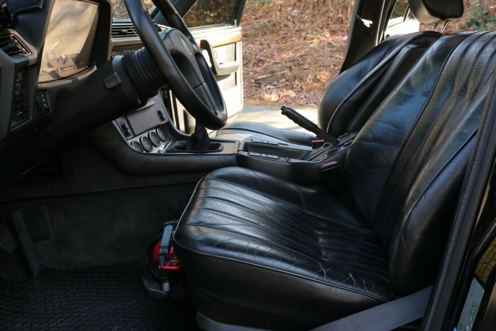 The classic 7-Series is equipped with the Executive Package, which includes black leather upholstery, wood trim, rear heated and reclining seats and rear-seat access to the radio and the front passenger seat adjustment. Moreover, it features a more modern A/C unit, aftermarket Alpine stereo, Racing Dynamics steering wheel and gearshift knob, auxiliary gauges in the center console and 9×16-inch BBS wheels with spacers and Kuhmo Ecsta tires.