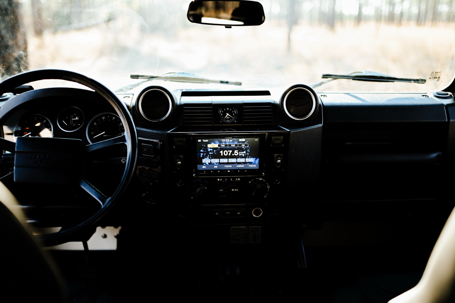 Diamond-stitched leather upholstery adorns the seats and door cards. Elsewhere, this classic Defender has a Puma-spec dashboard, upgraded HVAC system with anodized aluminum controls, custom instrument panel and 7-inch touchscreen infotainment system. It also sports a wireless charging pad inside the center console, dual USB ports, LED ambient lighting, Rockford Fosgate audio, piano black accents, remote engine start, and power windows and door locks.