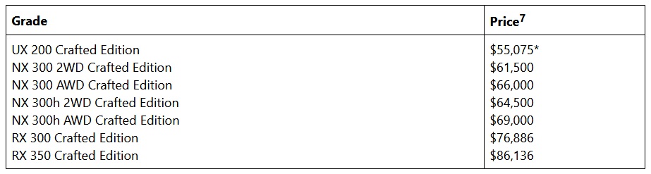 Pricing for the UX 200 Crafted Edition starts at AU$55,075 (US$43,334), while the NX 300 2WD Crafted Edition is available from AU$61,500 (US$48,390). The RX 300 and RX 350 will set buyers back at least AU$76,886 (US$60,496) and AU$86,136 (US$67,774) respectively.