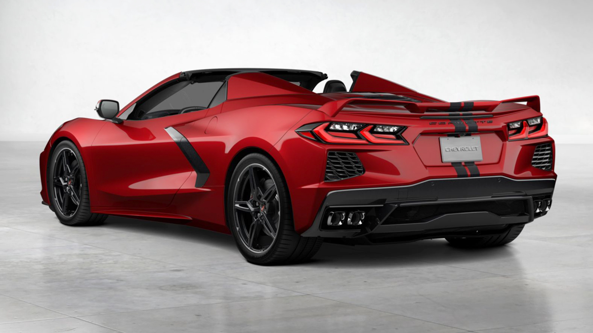 The Corvette Stingray Convertible in question is painted in Red Mist Metallic Tintcoat and comes with the available full-length Dual Racing Stripe Package finished in Carbon Flash Metallic. In addition, it has black wheels and includes the available Z51 package with Michelin Pilot Sport 4S ZP tires, revised suspension tuning, a rear spoiler, enlarged brakes, shorter final-drive ratio, an electronic limited-slip differential and a performance exhaust that lifts power from 490 to 495 hp and torque from 465 to 470 lb-ft (637 Nm).