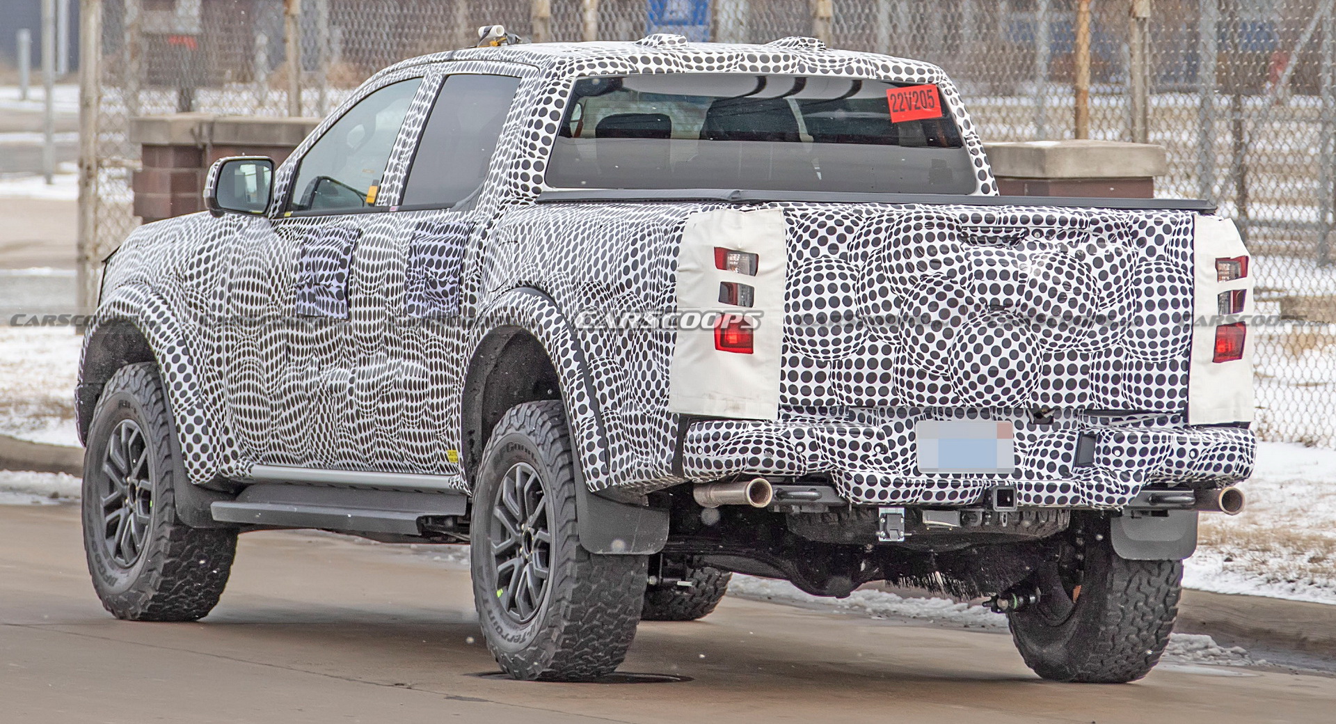 The camouflaged test car also features a dual-exit exhaust system that’s nicely tucked under the bumper for maximum ground clearance. Our spies report that both the Ranger Raptor and the Bronco Warthog sounded pretty similar, implying that the two models use the same powertrain. Rumors suggest that this is going to be a rumored 3.0-liter V6 Ecoboost unit with around 400 HP but the jury is still out.