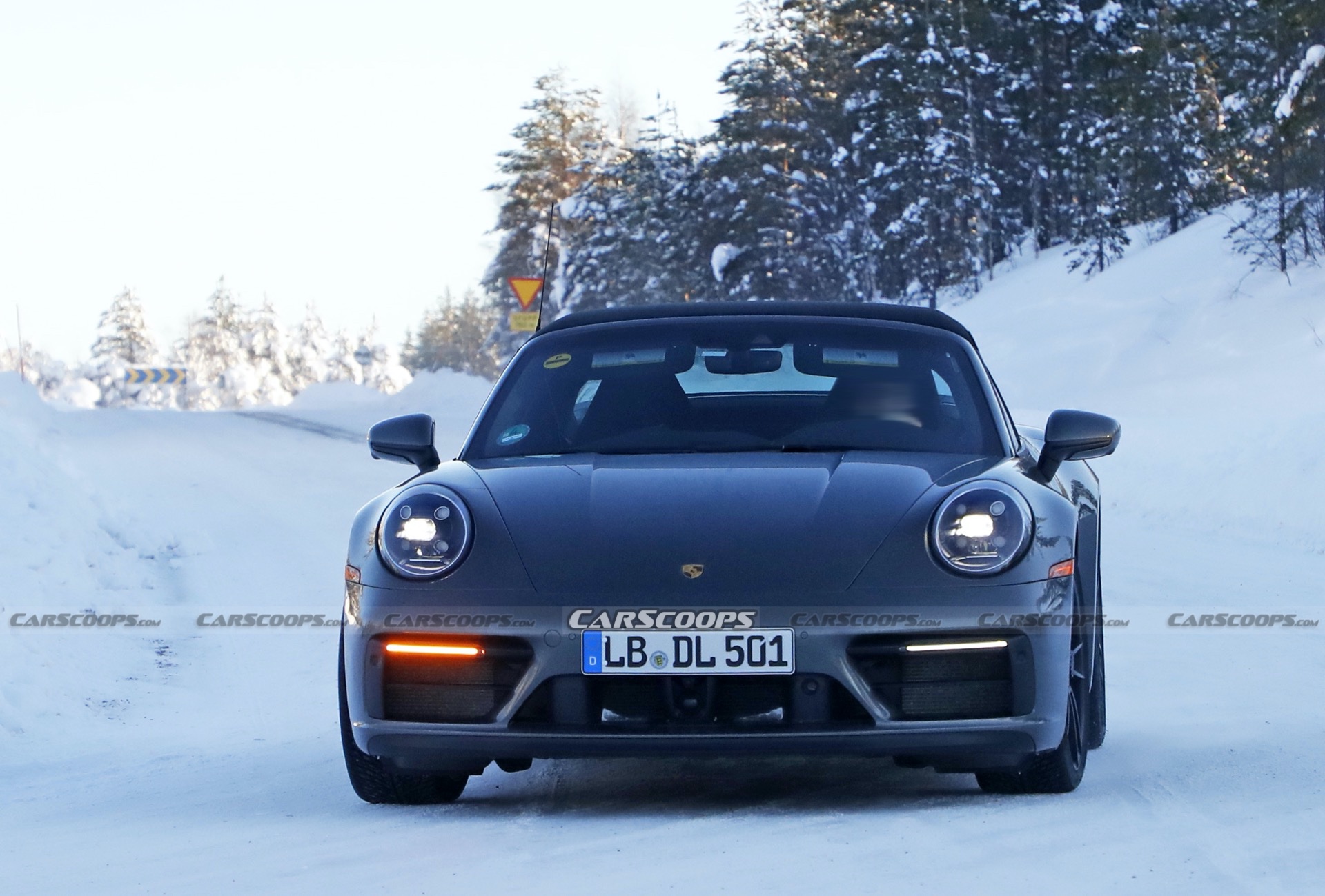 They depict an unclad, virtually production-ready 911 GTS Targa in the snow. Although it’s not the first time we’ve seen a GTS testing, it gives a great look at the middling performance model’s finer aspects. These include center-lock wheels, smoked headlights, plenty of blacked-out trim, and the 911’s Sport Design bumpers.