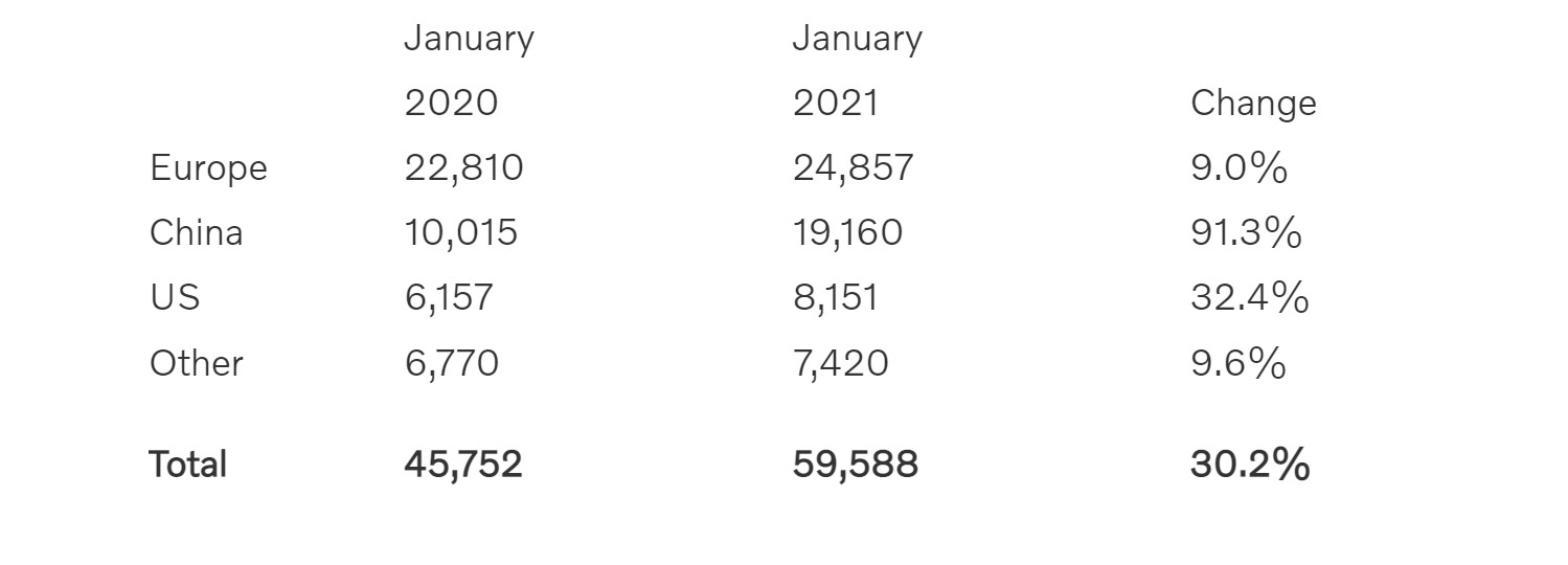 Although Volvo’s sales were not particularly strong a year ago (down by 9 percent compared to 2019), this doesn’t diminish its success last month, when it shifted 59,588 vehicles, recording the best January in its history.