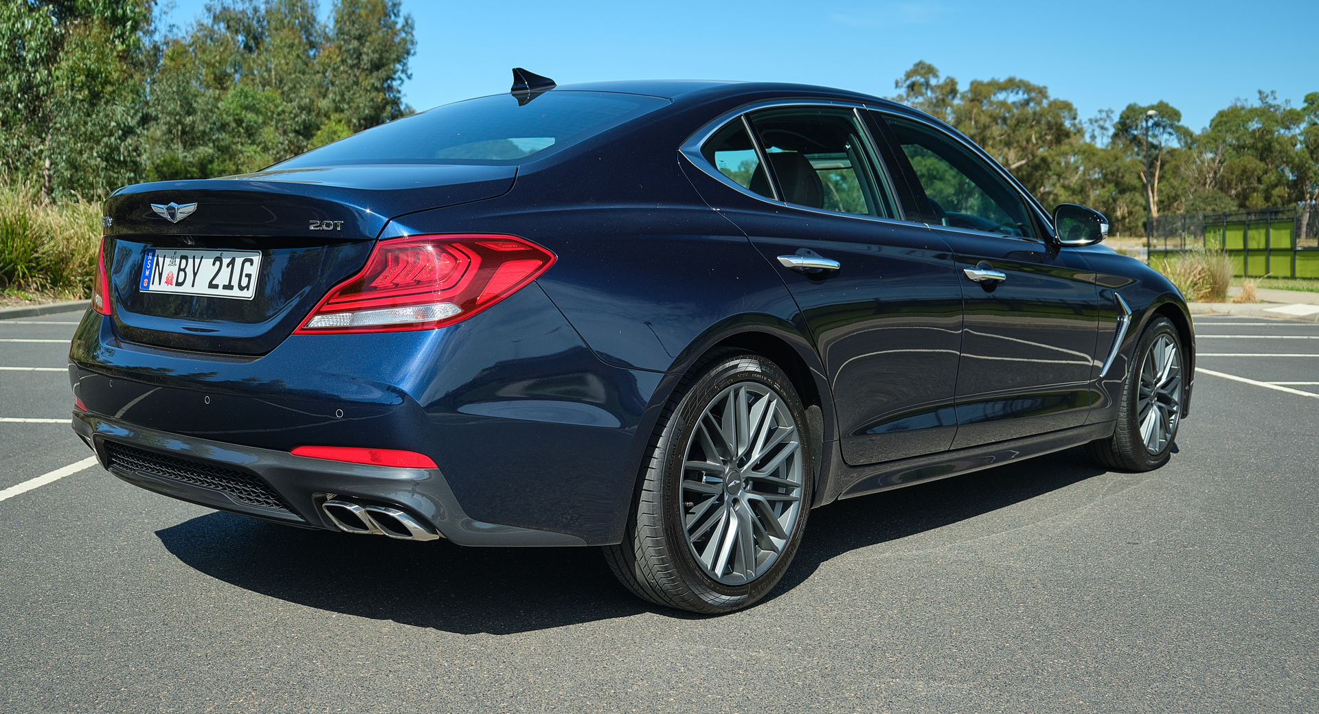 The most obvious visual point of difference between the 2.0T and the 3.3T is found at the rear where the dual, oval-shaped tailpipes on either side have been replaced by a simpler dual-tailpipe design at the lower right corner. The diffuser of the 2.0T is also more subtle and our test car was finished in Adriatic Blue, a shade only offered on this base model.