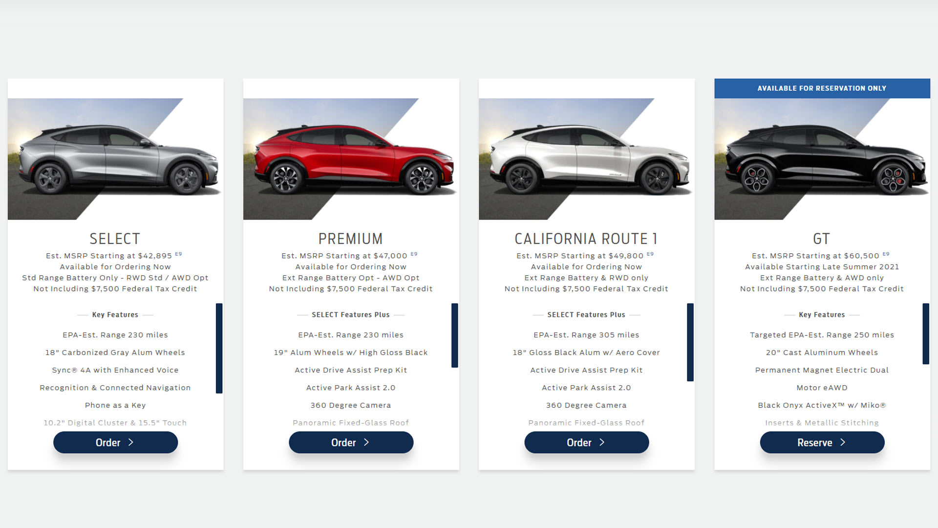 The Mach-E is currently available and pricing starts at $42,895. However, the model is eligible for a $7,500 federal tax credit and this drops the price to $35,395.