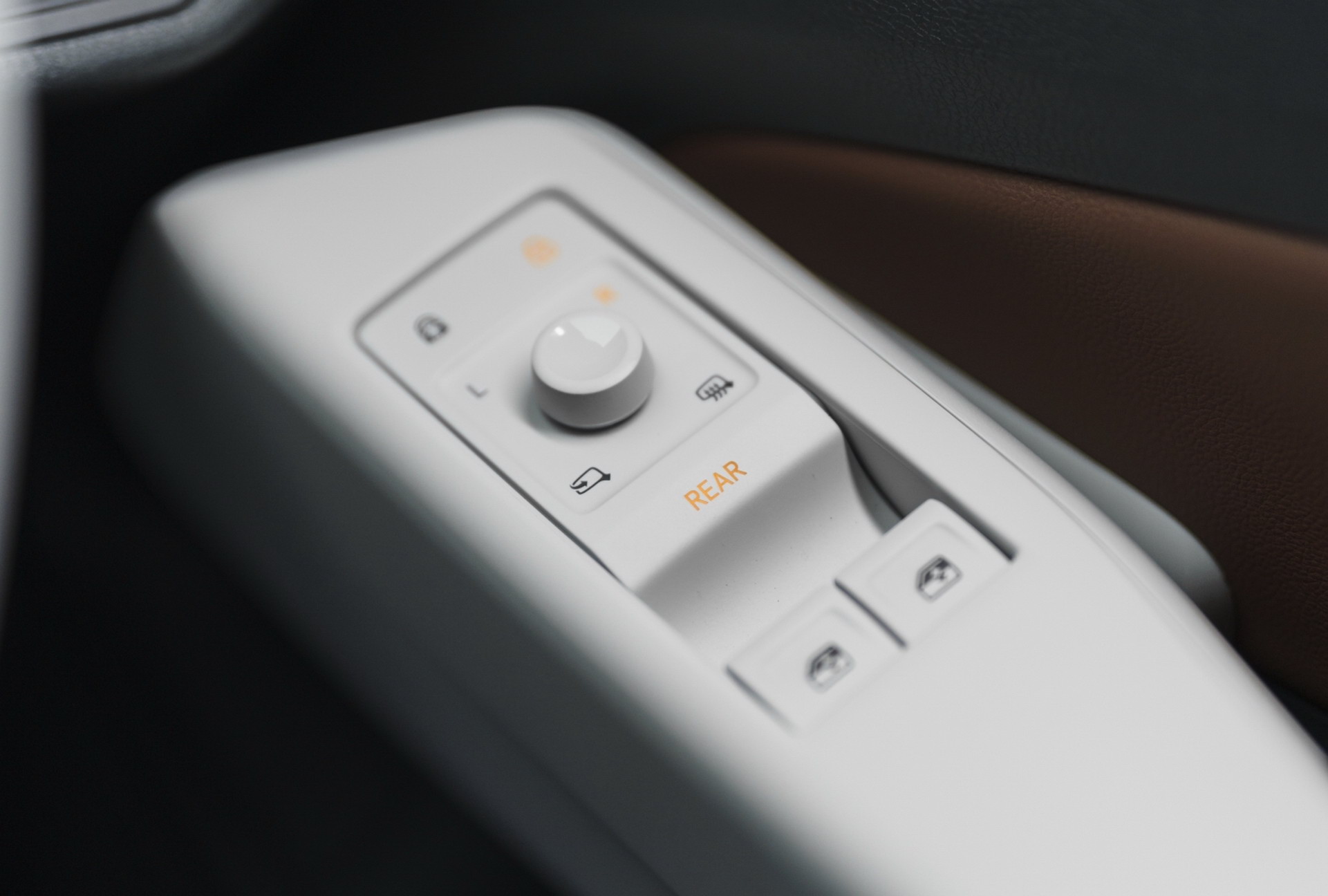 We say: The door panel has only two window switches, one each for left and right. If you want to operate the rear windows from the driver’s seat you have to push a separate button first, then use the same switches. It’s a pain and must save about 0.01 oz of weight.