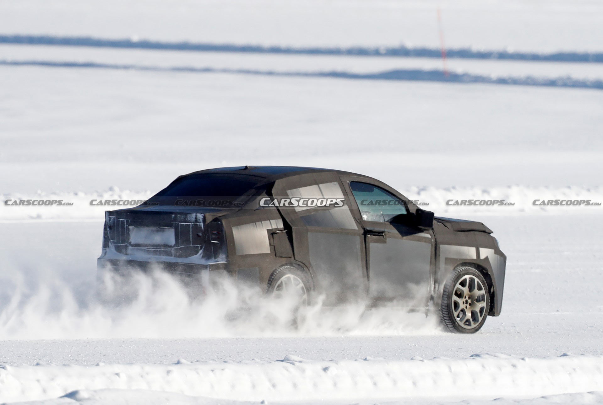 Caught undergoing cold weather testing on a frozen lake in Sweden, the model appears to be a high-riding sedan. The prototype is heavily disguised, but we can make out a few details including a black mesh grille and sizable wheels.