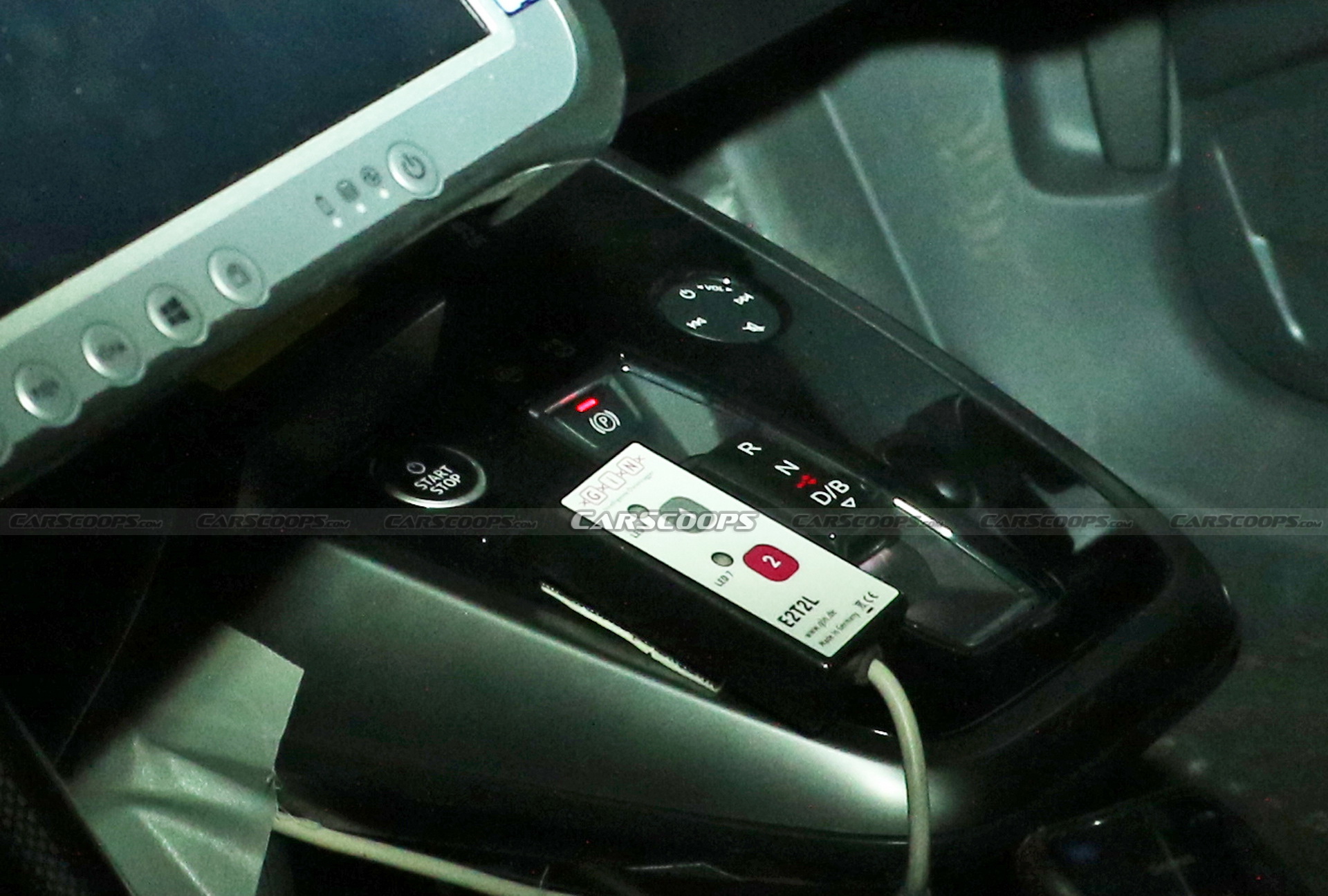 The semi-floating center console hosts the drive mode selector, next to the push-button start and another button used to control the audio system. Elsewhere, the prototype features two-tone upholstery that appears to be leather, as well as aluminum trim on the dashboard and door cards.