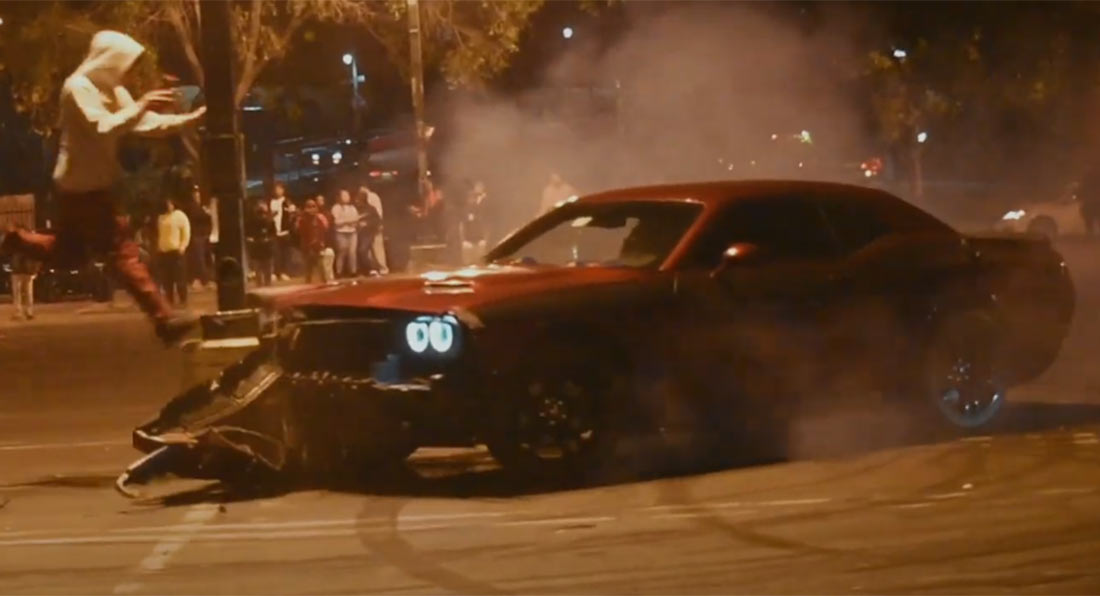 Dodge Challenger Slams Into Lamp Post While Showing Off, Almost Hits Young Man