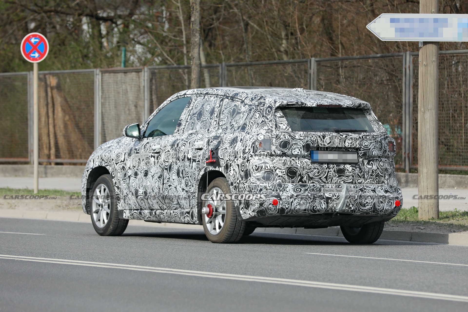 The BEV credentials are given away by the “electric test vehicle” stickers and the lack of tailpipes. Due to the heavy camo, it’s difficult to make out the SUV’s details, although we can discern that it will sport a reasonably-sized grille that, like the iX3, will be closed off.