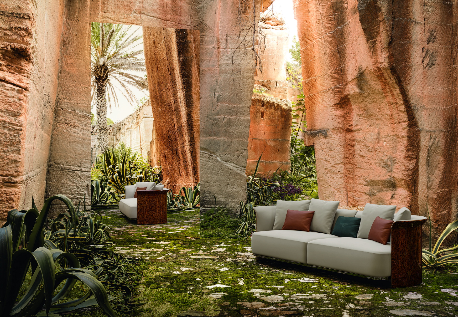 The actual material is called MARM-MORE and is making its debut in the furniture world with this couch. Eventually fashioned into a fabric, the material starts as the bi-product of marble production. The dust is mixed with a special composite to obtain liquid microfilm, which is then mixed with textiles to produce a fabric and a circular economy.