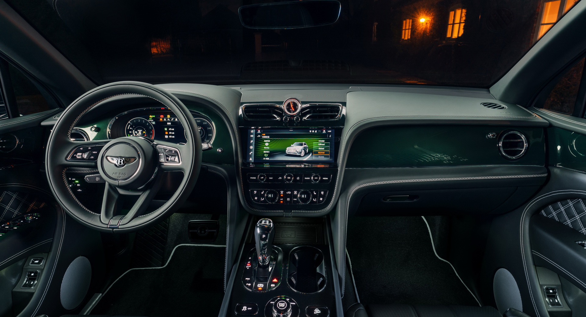 Moving on to the interior, the same theme continues with the Cumbrian Green leather upholstery, matching piano veneer, and over 100 meters of contrasting bright white cross-stitching found everywhere, from the door cards, seatbacks, and even in the piano Cumbrian Green veneer via a unique overlay. The process of hand cross-stitching the interior of a Bentayga takes no less than 44 hours to complete.