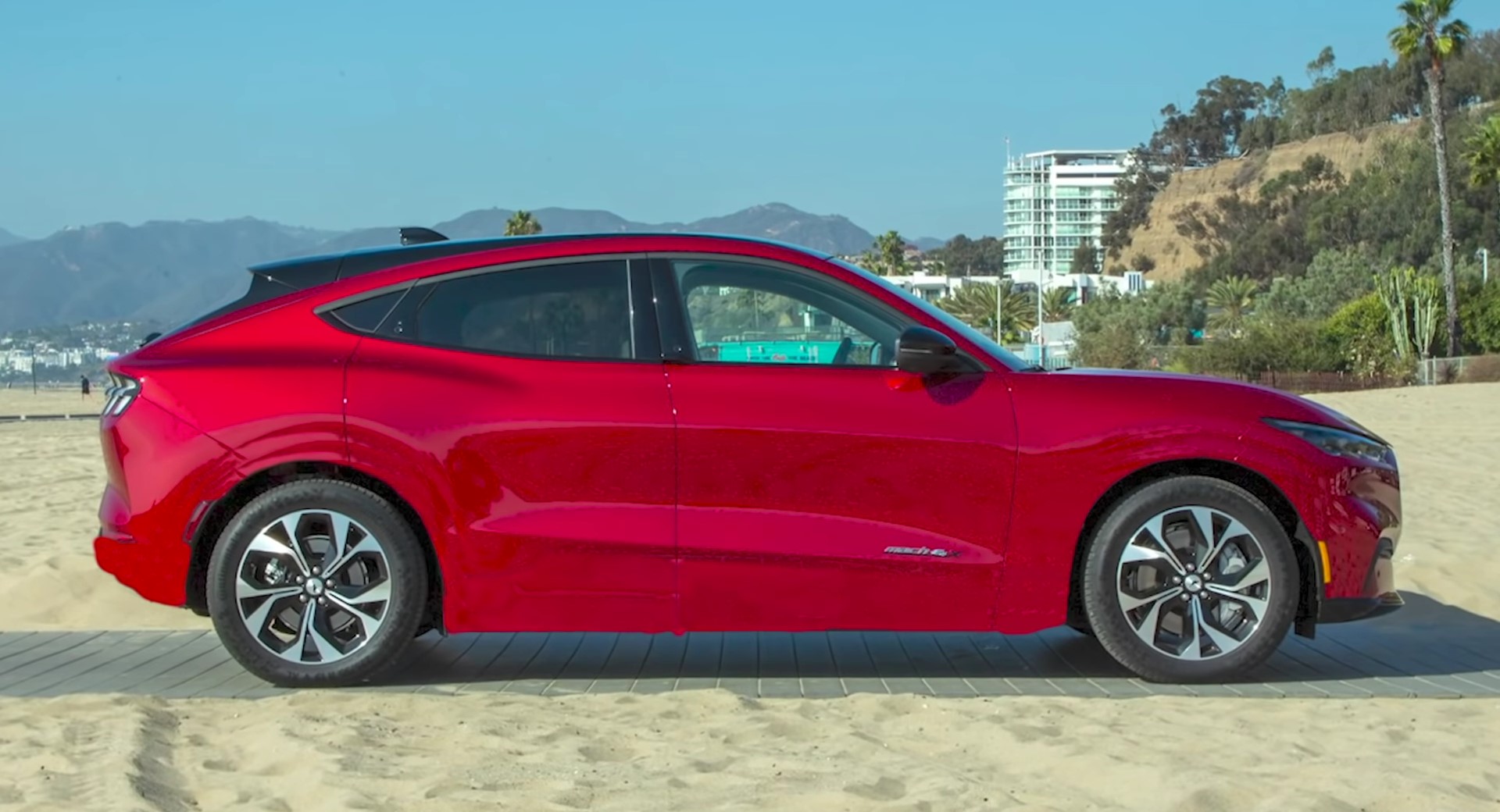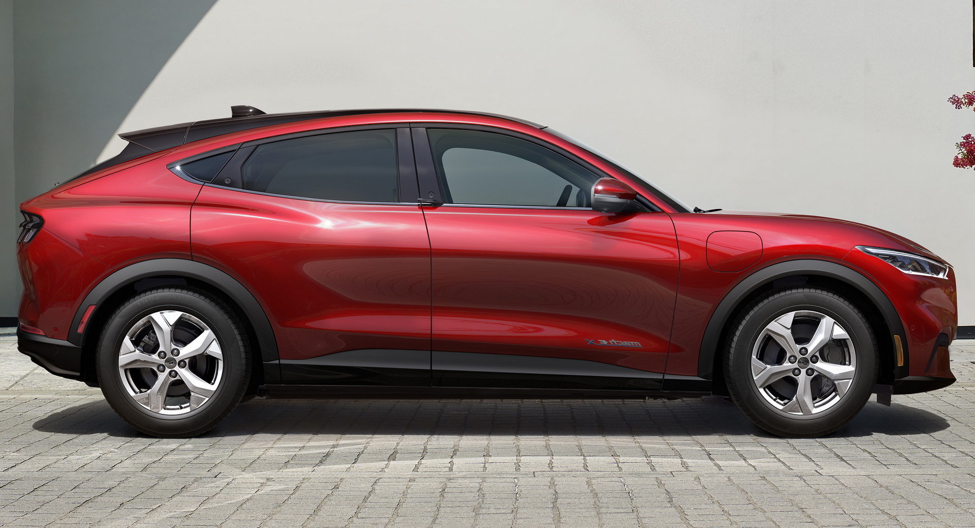 Indeed, in a photo with the trickery crudely rendered out (above), the EV looks massive and artless from the side. With the tricks, the Mach-E looks a little lighter and a little more elegant. For something bearing the name of a pony car, that’s a good thing.