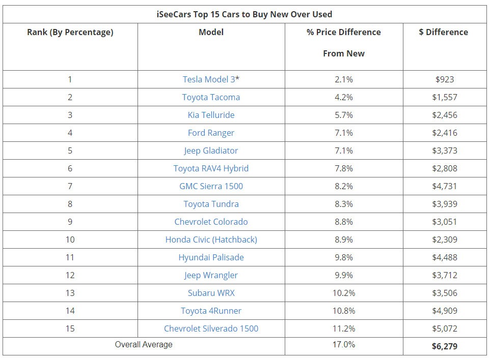 The Tesla Model 3 had the smallest price difference as buying a one-year old model will only save customers $923, which is a difference of 2.1%. Following closely behind was the Toyota Tacoma, which is 4.2% cheaper used for a savings of $1,557. Rounding out the top five are the Kia Telluride ($2,456), Ford Ranger ($2,416) and Jeep Gladiator ($3,373). These relatively modest savings mean customers are likely better off buying new.