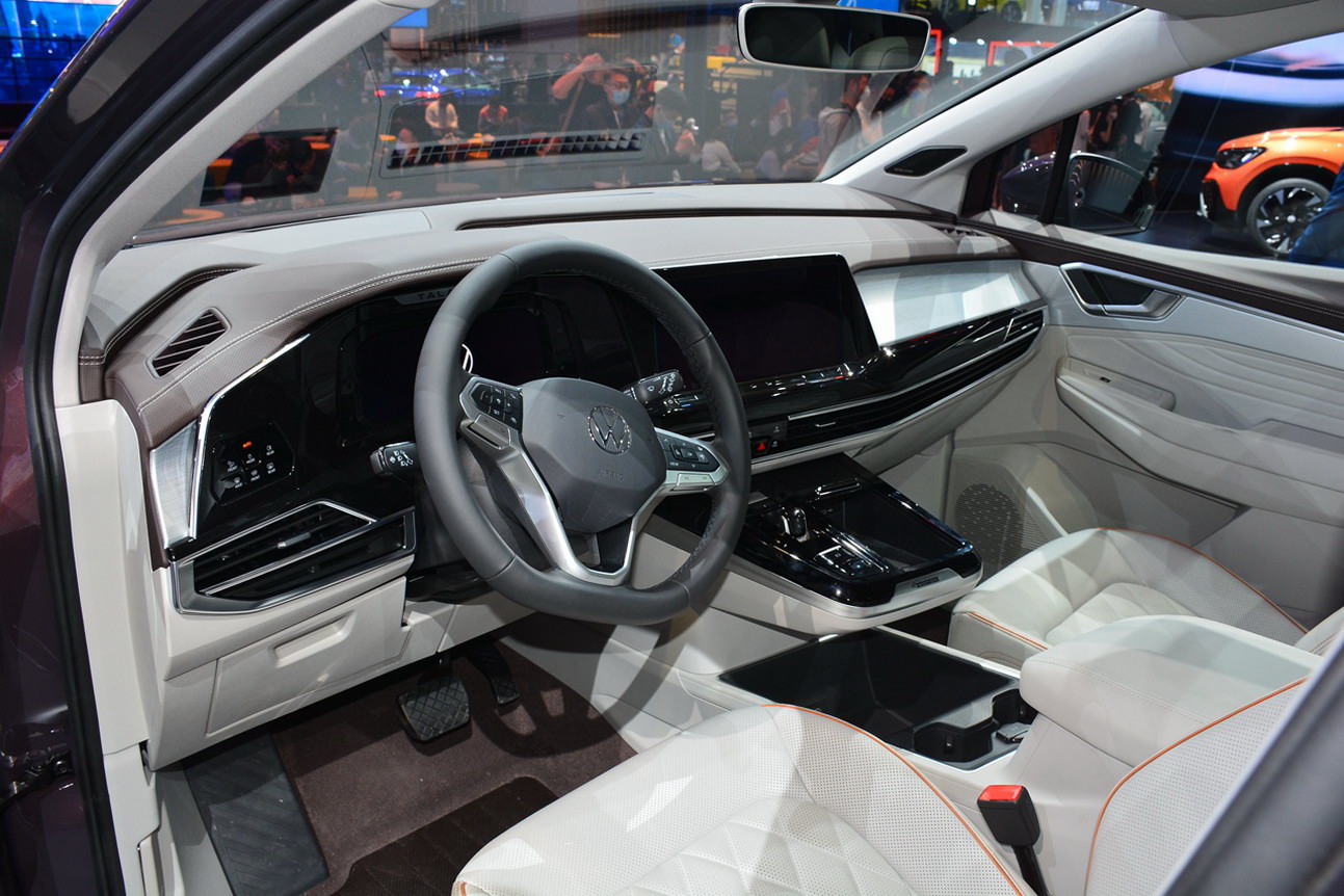 Six or seven adults can sit inside, depending on the arrangement, and besides the three-spoke steering wheel that seems very similar to the Atlas/Teramont, the two models don’t have much in common inside. For one, the dashboard has a more modern design in the Talagon, and hosts a free-floating large infotainment screen, next to a digital instrument cluster. The center console looks different too, and the pictured example was dressed in leather with contrast stitching and piping.