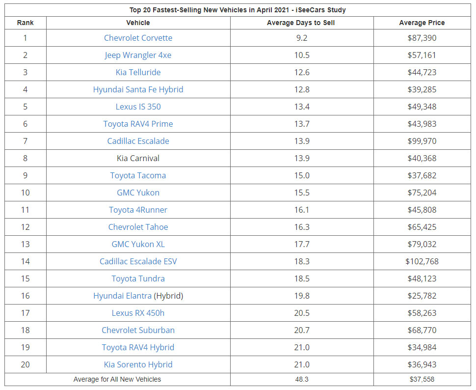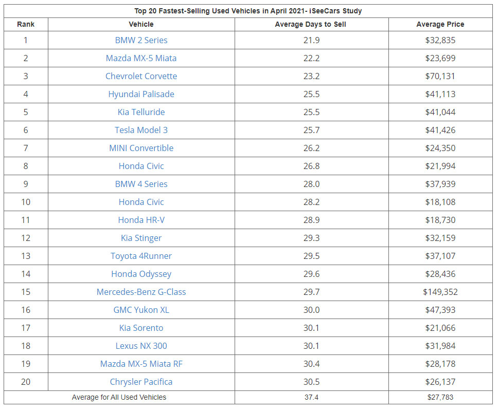 It was followed by the Mazda MX-5 Miata (22.2 days / $23,699) and Chevrolet Corvette (23.2 days / $70,131). Rounding out the top five where the Hyundai Palisade (25.5 days / $41,113) and Kia Telluride (25.5 days / $41,044).