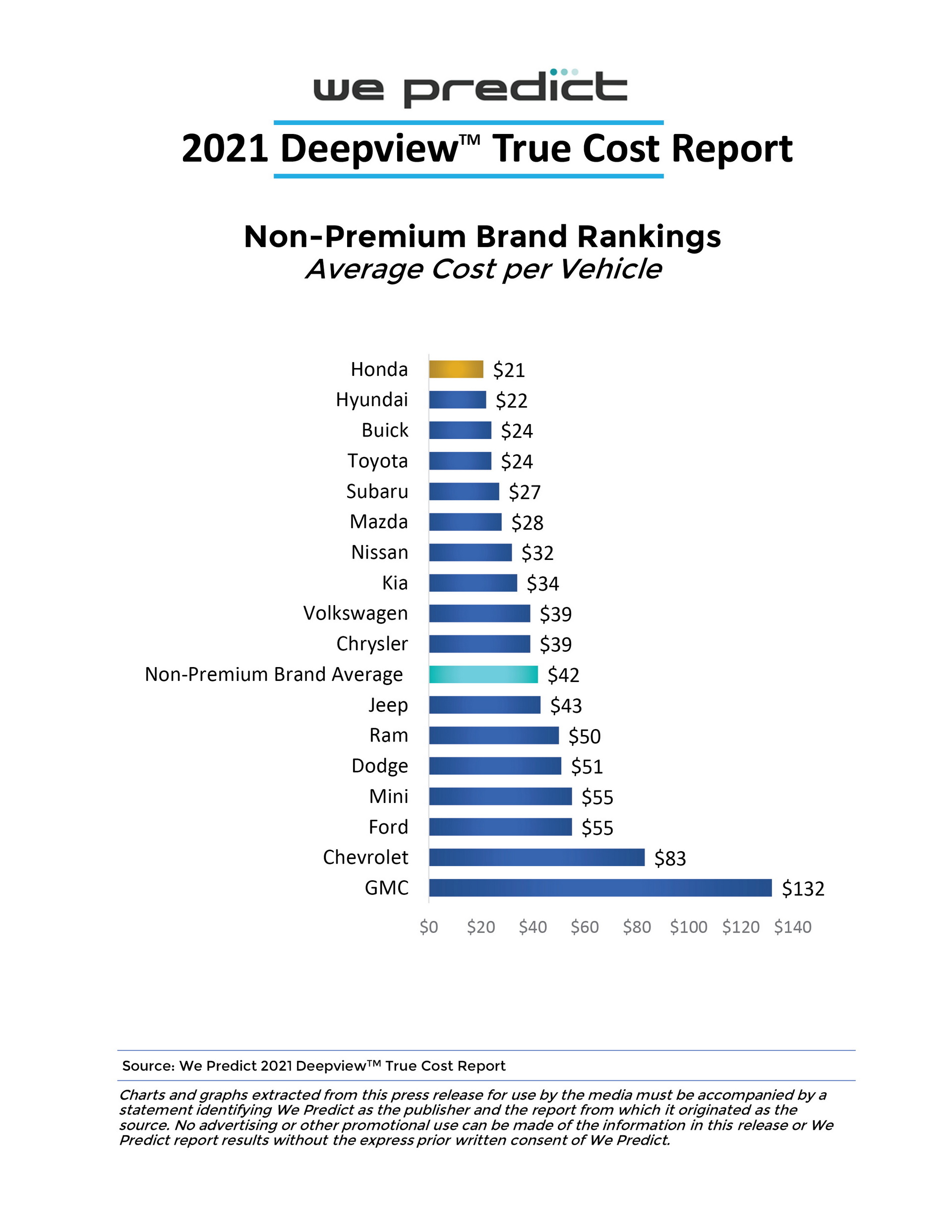 In terms of the wider industry, the non-premium brand with the lowest cost per vehicle in this study was Honda. Its cars had $21 worth of repairs in the first 90 days of ownership, on average. The worst was GMC, whose repairs totaled $132 on average.