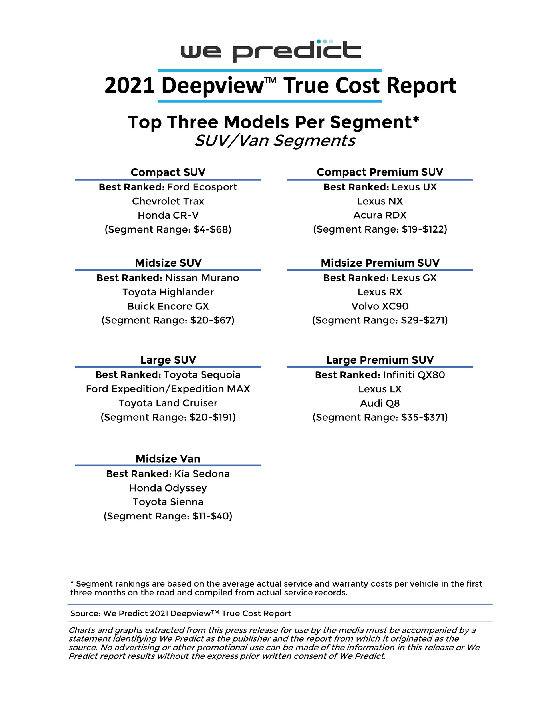 Despite Honda’s strong performance in the brand rankings, Toyota Motor Corporation’s vehicles were the cheapest to main in four segments (midsize premium SUV, Lexus GX; compact premium sporty car, Lexus LC; compact premium SUV, Lexus UX; and large SUV, Toyota Sequoia), the most of any brand.