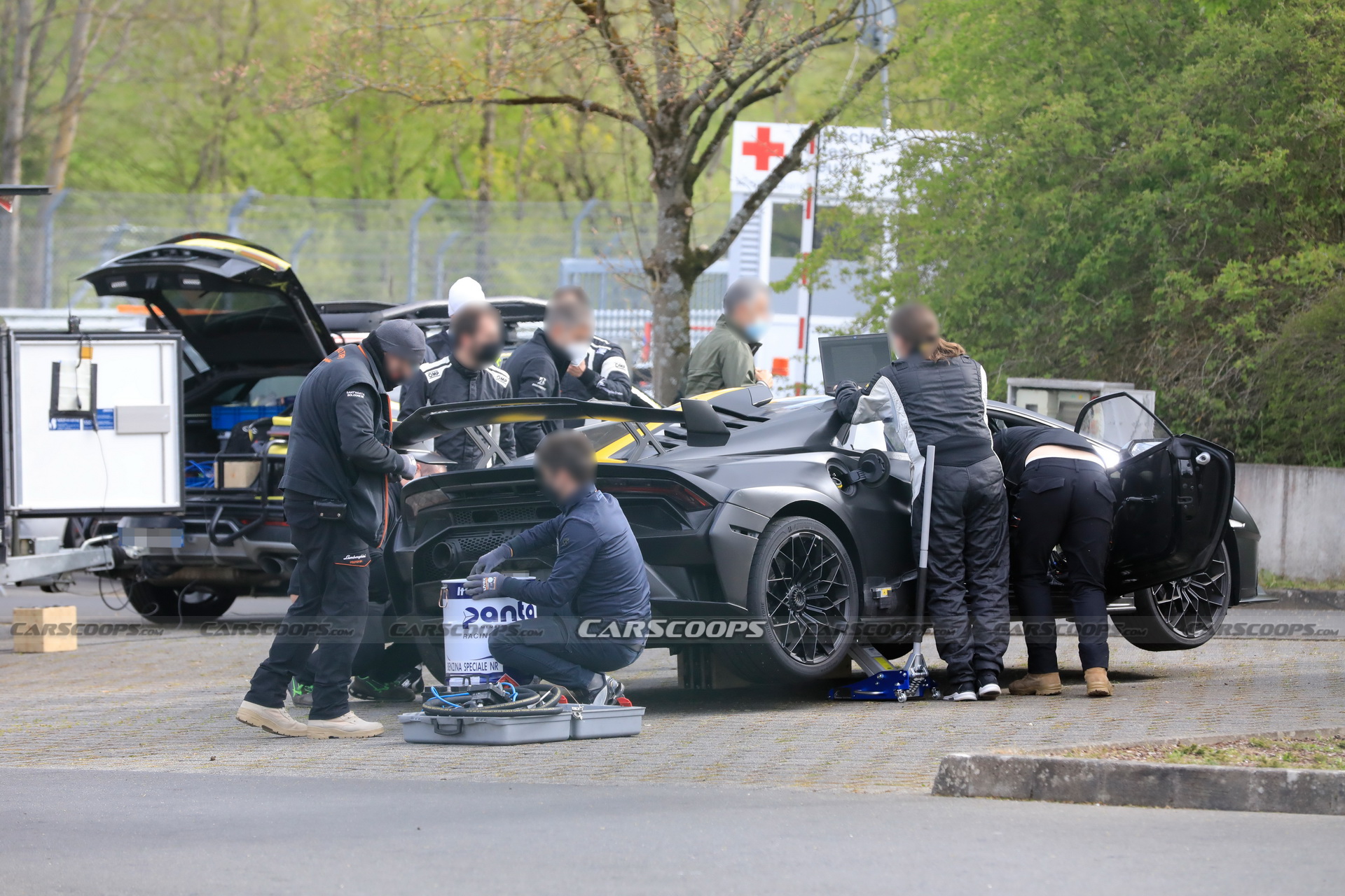 It is understood that the automaker has brought two examples of the Huracan STO to the ‘Ring and spent several days fine-tuning them. In some of these spy shots, engineers can be seen working on the cars and have also brought with them a Lamborghini Urus towing a trailer filled with parts, including several barrels of Panto racing fuel. Evidently, they are keen to extract as much performance out of the STO as possible.