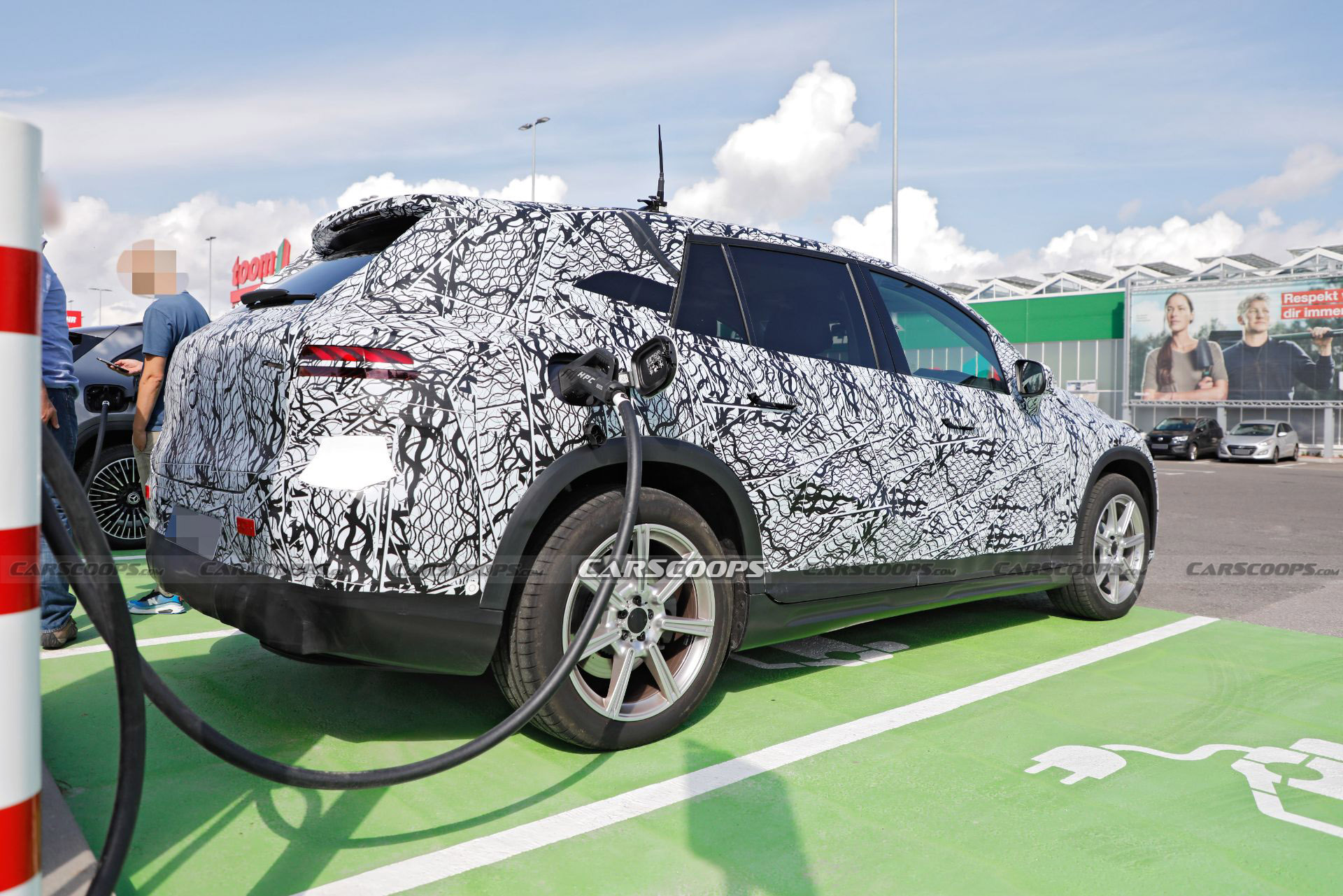 Our spy photographers caught the EQS SUV at a charging station, together with the smaller EQA. The heavy camouflage of earlier test cars has gone, revealing more design details. These include the production LED headlights which in typical EQ fashion are connected to the covered grille and the small intakes on the front bumper.