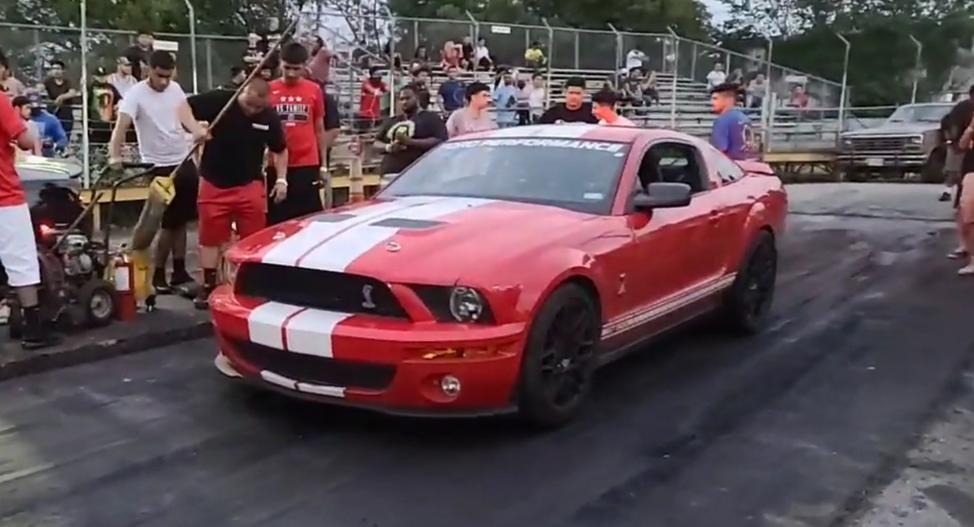 The four youngsters were in a fifth-generation Mustang GT500. The car, which is apparently on Toyo R888 tires (if the person narrating is to be trusted), appears to launch better than its opponent, a Dodge Charger Hellcat, before spinning up its rear tires and running into the wall on its side of the drag strip.