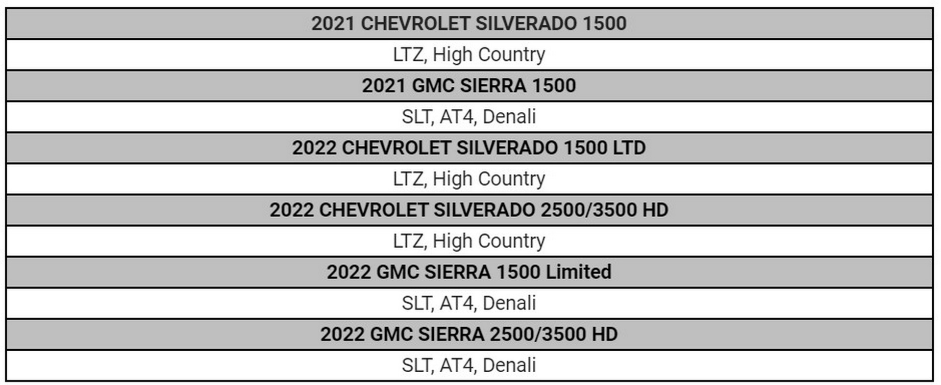 Some GMC Sierra and Chevrolet Silverado pickup trucks will have to go without the heat seating option for their second-row seats.