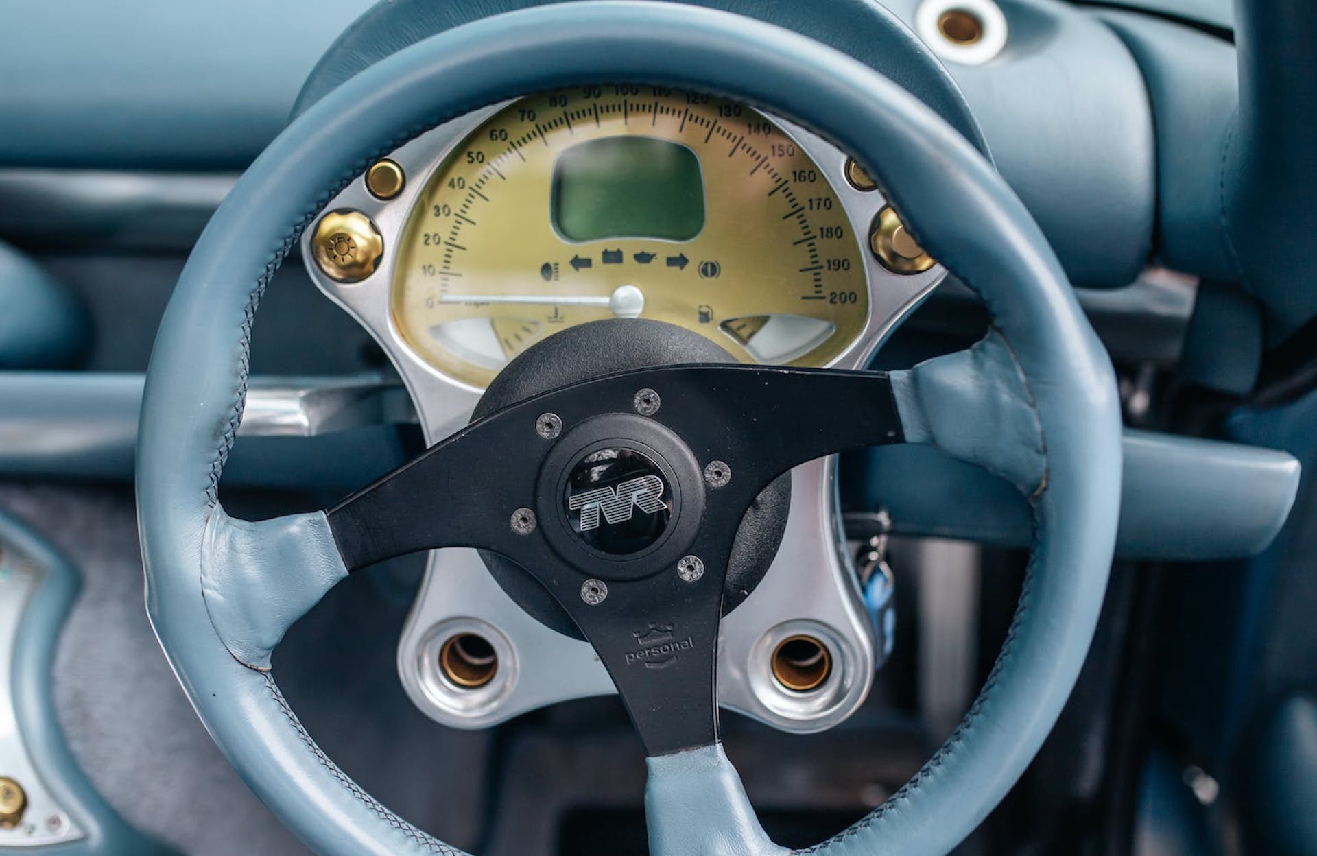 The Cerbera featured a fairly conventional set of traditional-looking clocks visible through the top half of the steering wheel, but two additional gauges (plus an air vent) below it.