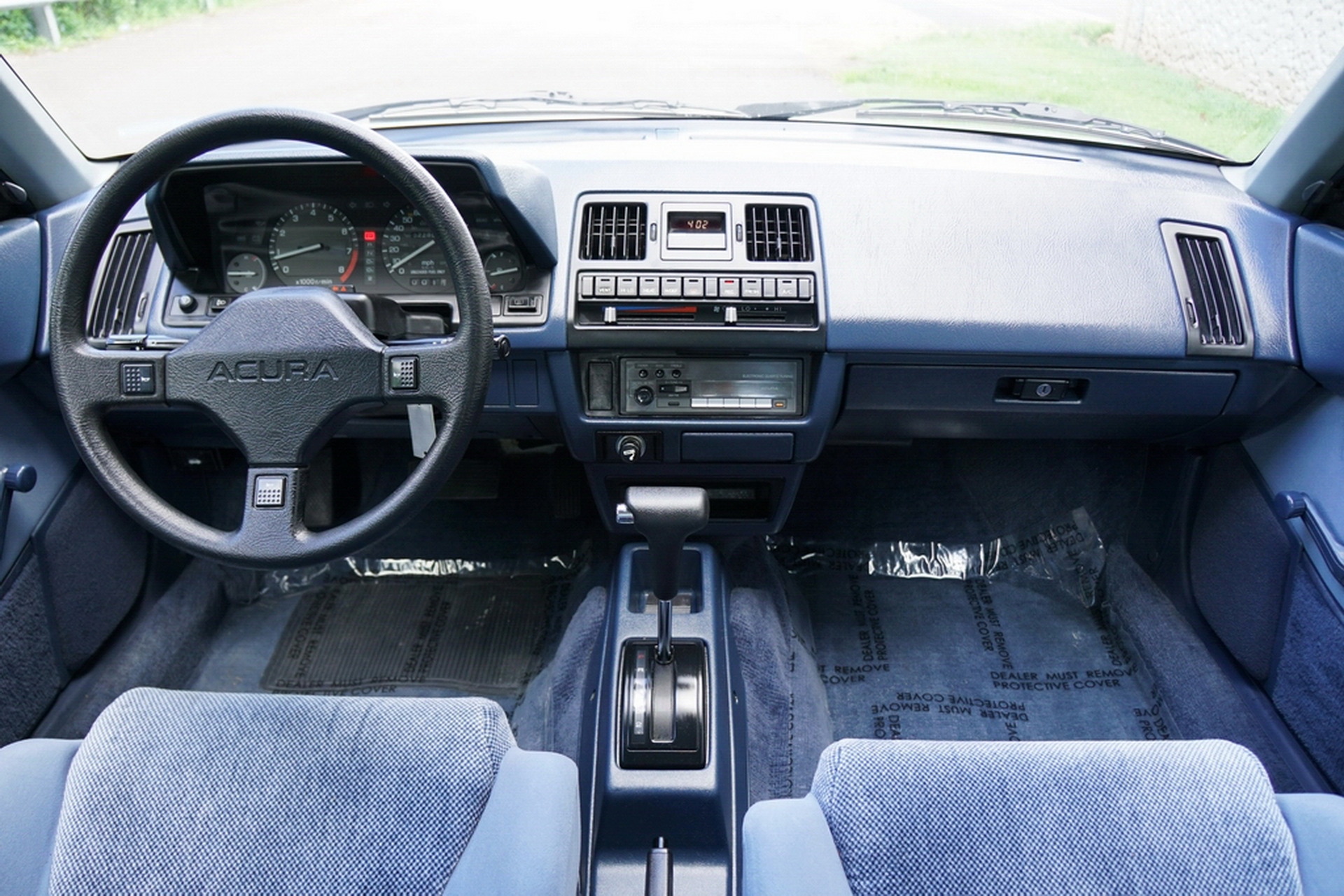 The white paint adorning this Acura‘s boxy exterior appears to be in mint condition, and the side pinstriping and stock wheels ensure it keeps that original look. Other than that, the car is fairly basic, but that’s the whole point. Moving to the the interior, the cloth seats and carpeting are both immaculate, and the latter even has plastic protectors on it to keep it clean. Also included are Integra-branded floor mats, which are shown photographed in this car’s liftback trunk.