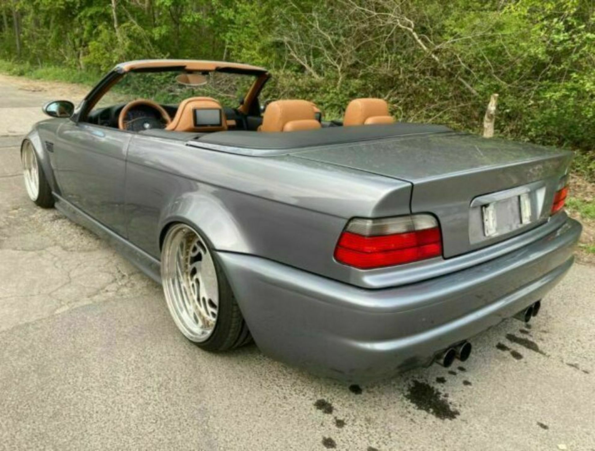 The bumpers, side sills, and wide fenders are sourced from an M3, like the quad exhaust pipes on the rear diffuser. Last but not least, the owner chose a set of aftermarket wheels that don’t look properly attached to the low-profile tires.