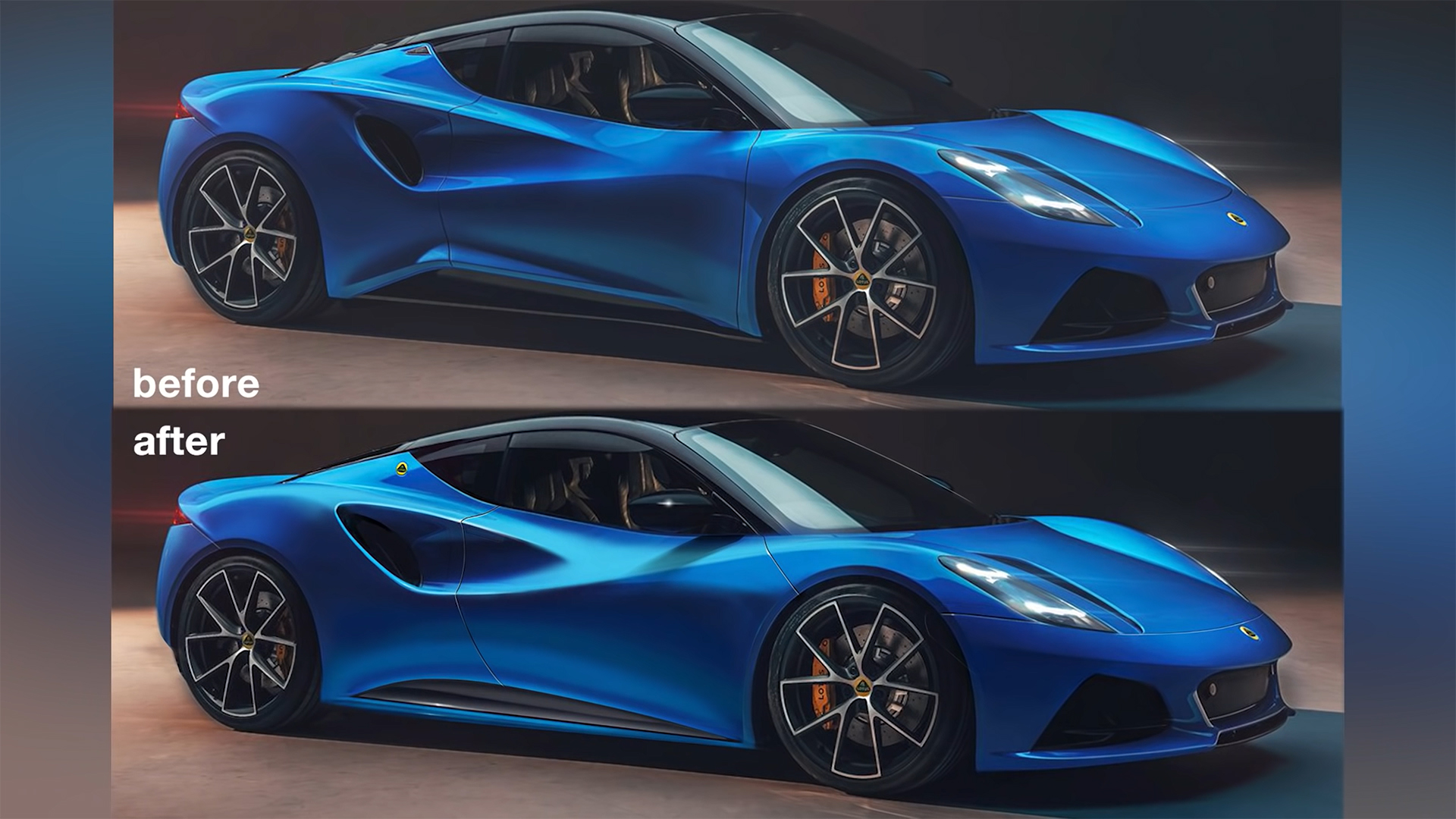 Overall, he liked the simple, more mature look of the side. That being said, he felt the black trim running along the side skirts was a little too large, so he added a body-colored strip along the bottom to give more of an impression that it hugs the road. He also admired the line flow of the intake, but slightly modified how the lines connect to clean up the design a bit. His final change to the side involved swapping out the Emira badge near the window in favor of a Lotus emblem.