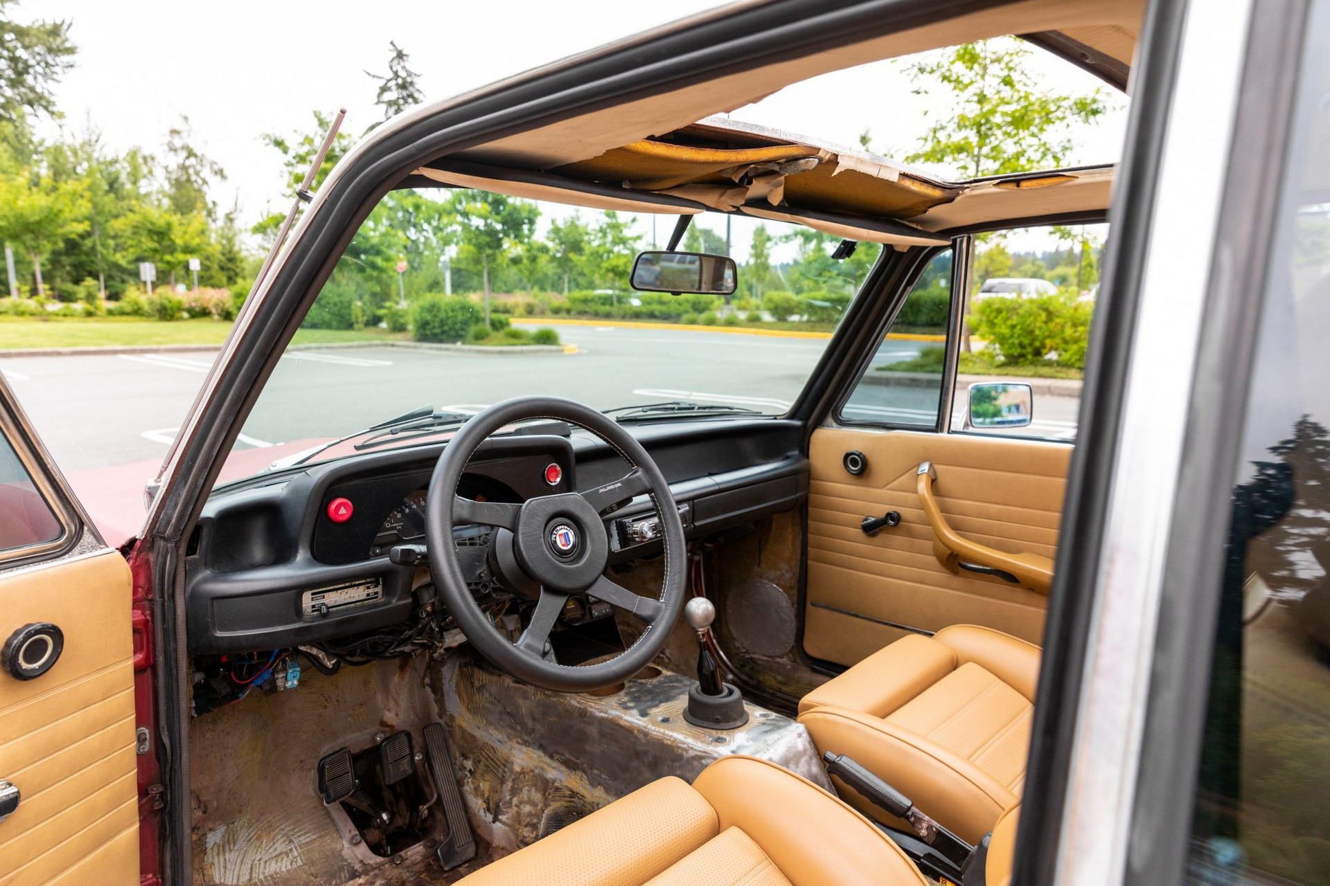 Inside, the car features tan-upholstered Recaro sport seats and door panels from an E21, and a 15-inch Alpina steering wheel frames a Honda S2000 gauge cluster. Additional equipment includes an AEM boost gauge, an AEM air-fuel ratio gauge, and a Pioneer CD stereo head unit. The lower parts of the interior remain unfinished because the seller wanted to make it a good driver’s car first before worrying about the aesthetics, but pushback from his wife on the project caused the latter to come to a halt.
