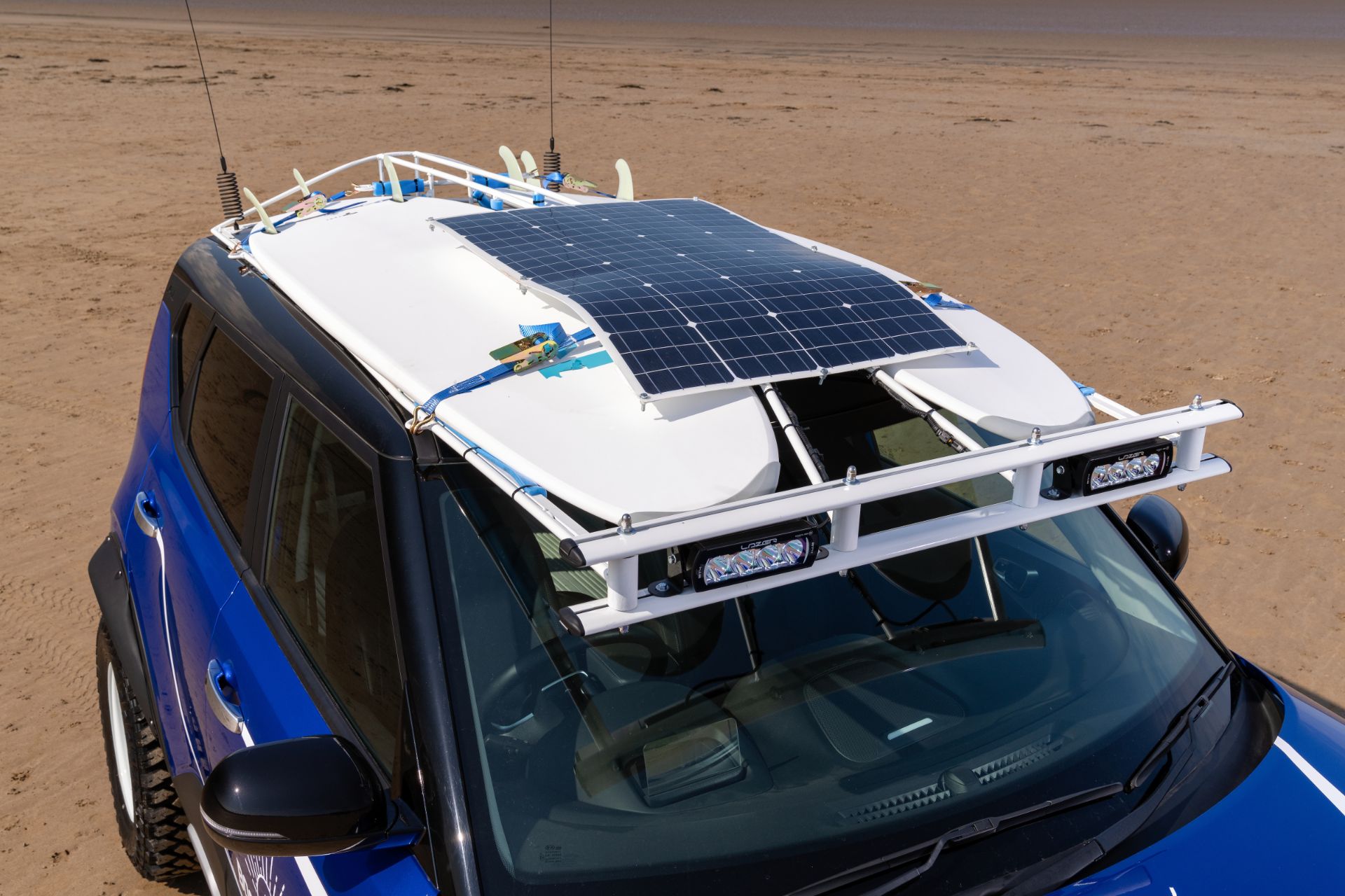 Besides the wheels and the vastly increased height (an impressive 1,950 mm or 76.8 inches), visual changes include plastic fender add-ons, a custom-built roof rack from lightweight steel, roof-mounted Lazer ST4 Evolution LED spotlights and white graphics on the Neptune Blue metallic paint. Surfers will be able to accommodate two 7ft9 Tahe Bic Malibu boards on the roof rack and plenty of gear in the load area.