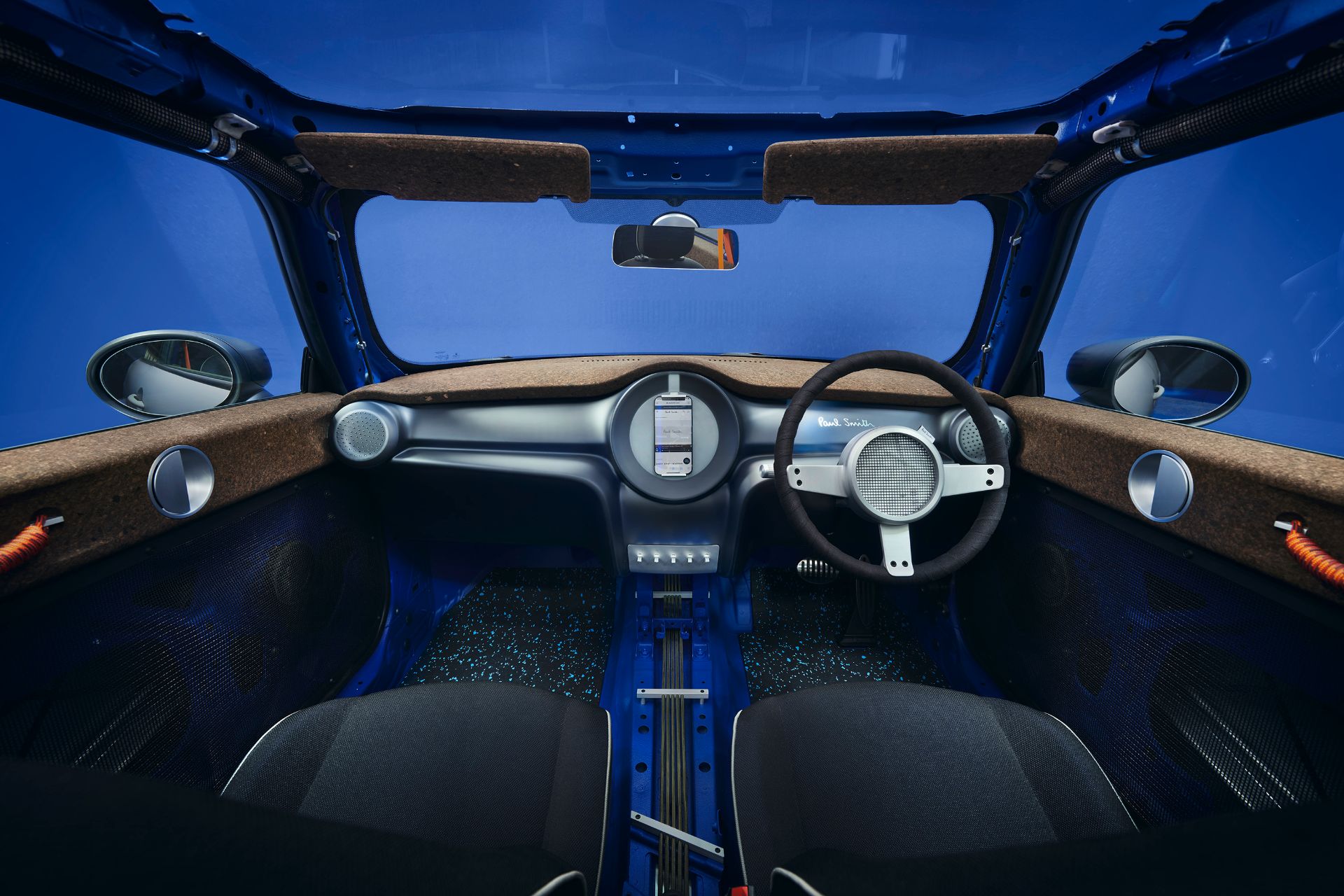 What is more impressive than the exterior is the stripped-out cabin. Recycled cork – a material that absorbs carbon dioxide during its production – has been used for the top of the dashboard, the sunshades, and the top of the doors as an alternative to the traditional foamed plastic material. All other trim panels were omitted, exposing the basic metal structure, which here is painted in blue.