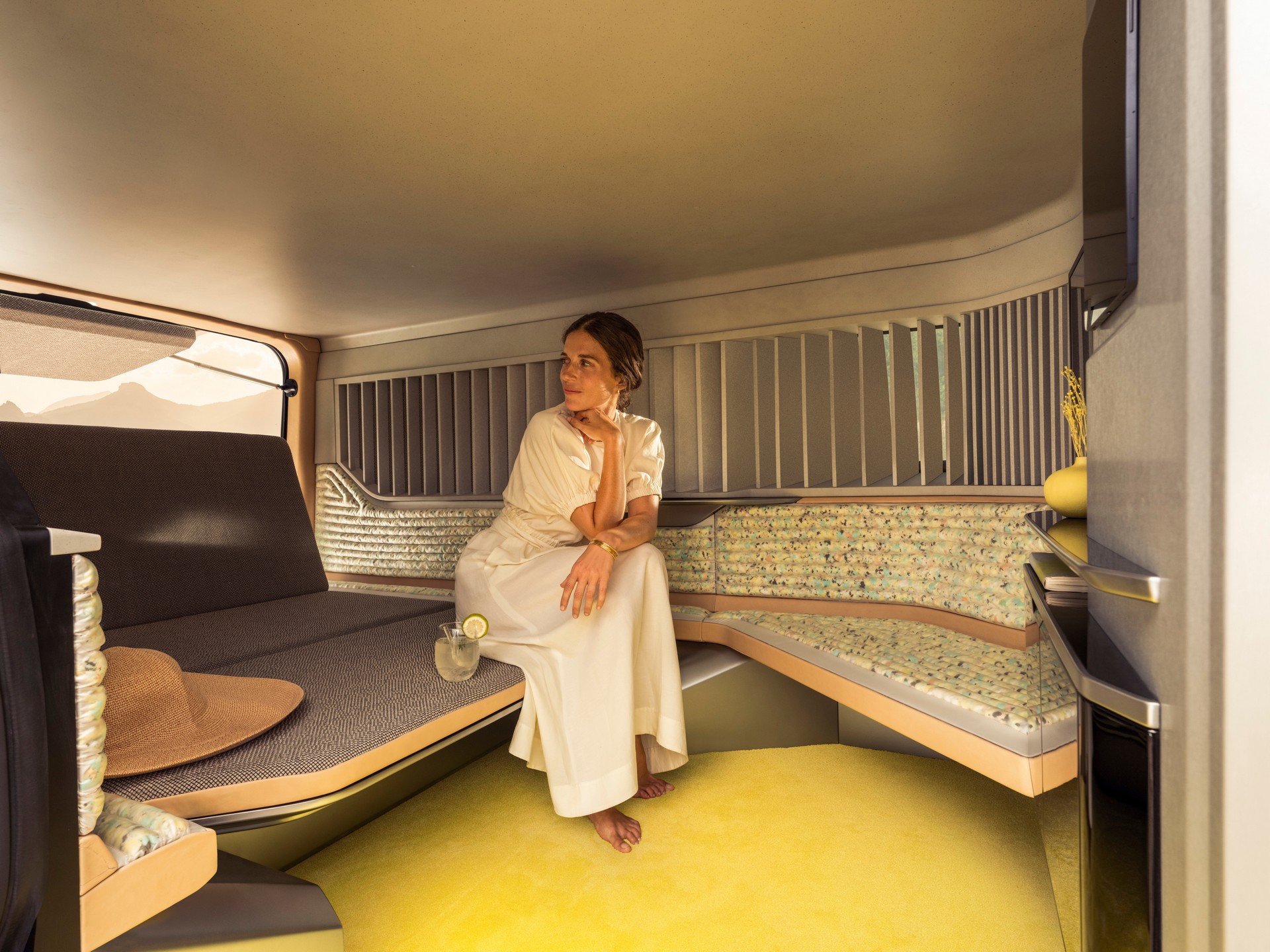 Renault didn’t say much about the concept, but it features a stylish cabin with linen and wool upholstery. The back of the van is separated from the front and it looks like a stylish living room as occupants will find yellow carpeting, a bench seat and what appears to be an elegant storage compartment.