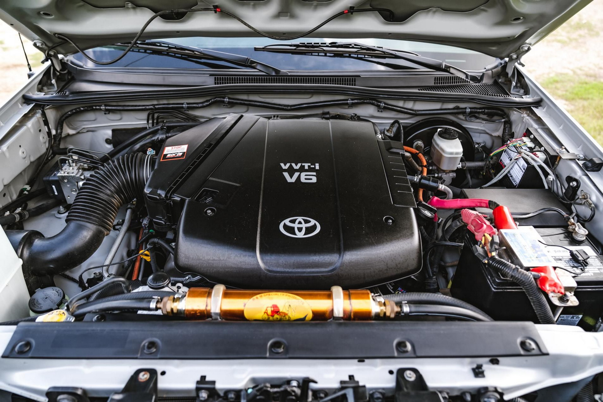 Uner the hood is the stock 4.0-liter V6, which sends 236 hp (239 PS / 176 kW) and 266 lb-ft (361 Nm) of torque to the rear or all four wheels via a six-speed manual transmission and a two-speed transfer case. And seeing as that cab and all its accessories adds a significant amount of weight, the Tacoma received suspension and drivetrain enhancements in the form of air suspension, Old Man Emu Nitrocharger shocks, Emu Dakar leaf springs, and ARB front and rear air-powered differential lockers.