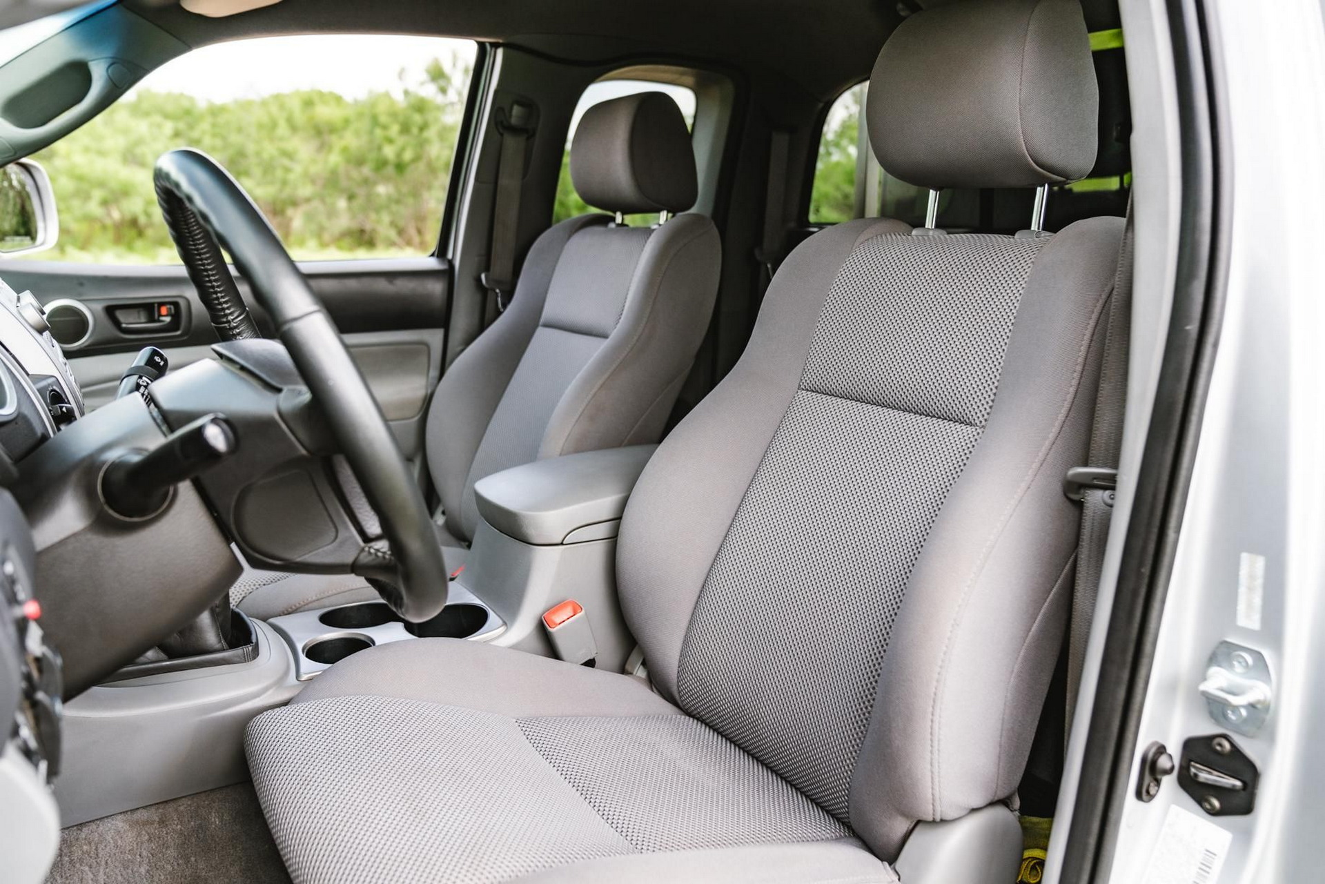 The interior remains stock with its grey cloth seating, but it does have some nice amenities like cruise control, air conditioning, power door mirrors, and a six-speaker sound system with a CD player. There are also a Midland 1001Z 40-channel CB radio and all the switches that control the aftermarket accessories, but other than that, it’s just a regular (albeit very well-kept) Tacoma.
