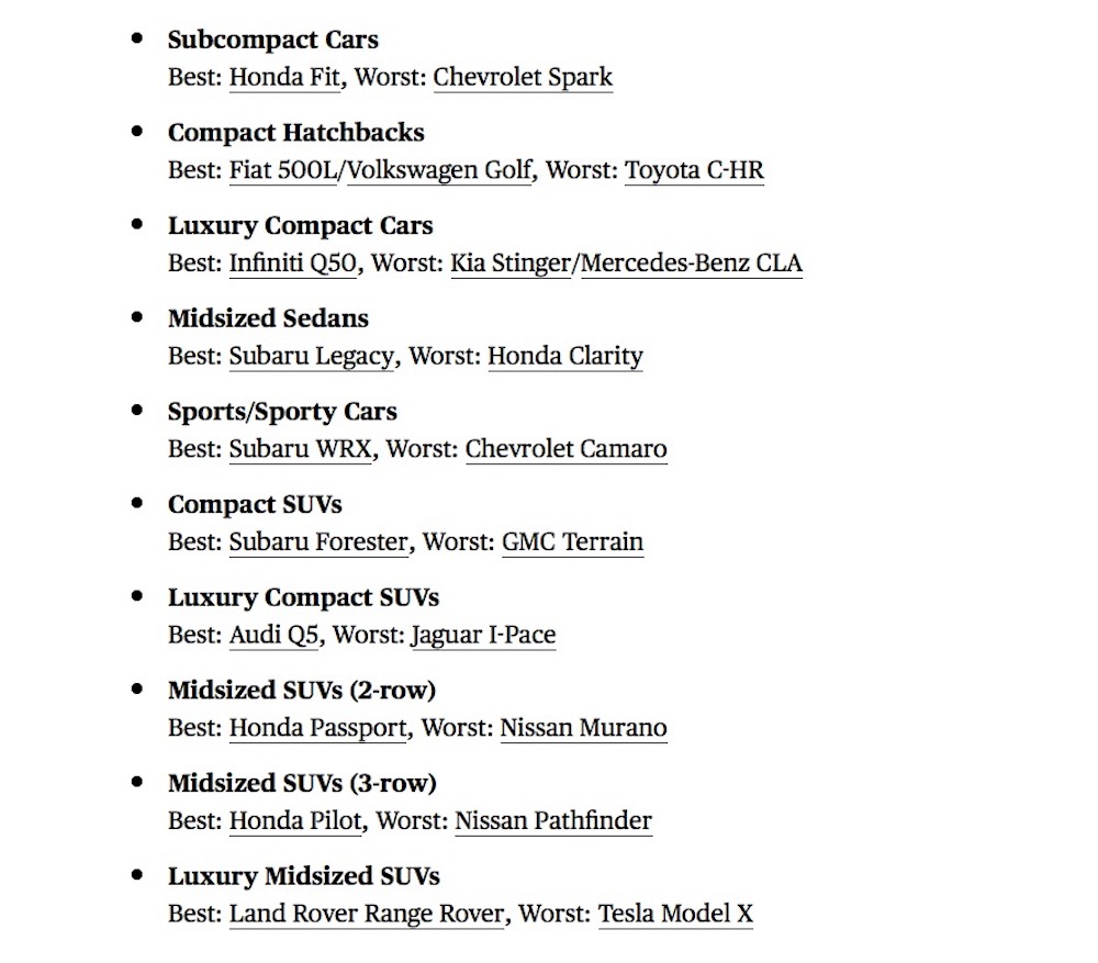 In fact two more Subarus, the WRX and the Legacy were rated best in class, while Honda also scored three “bests” with the Fit, Passport and Pilot, but ranks less well than Subaru overall because the Clarity was ranked the worst midsize sedan.