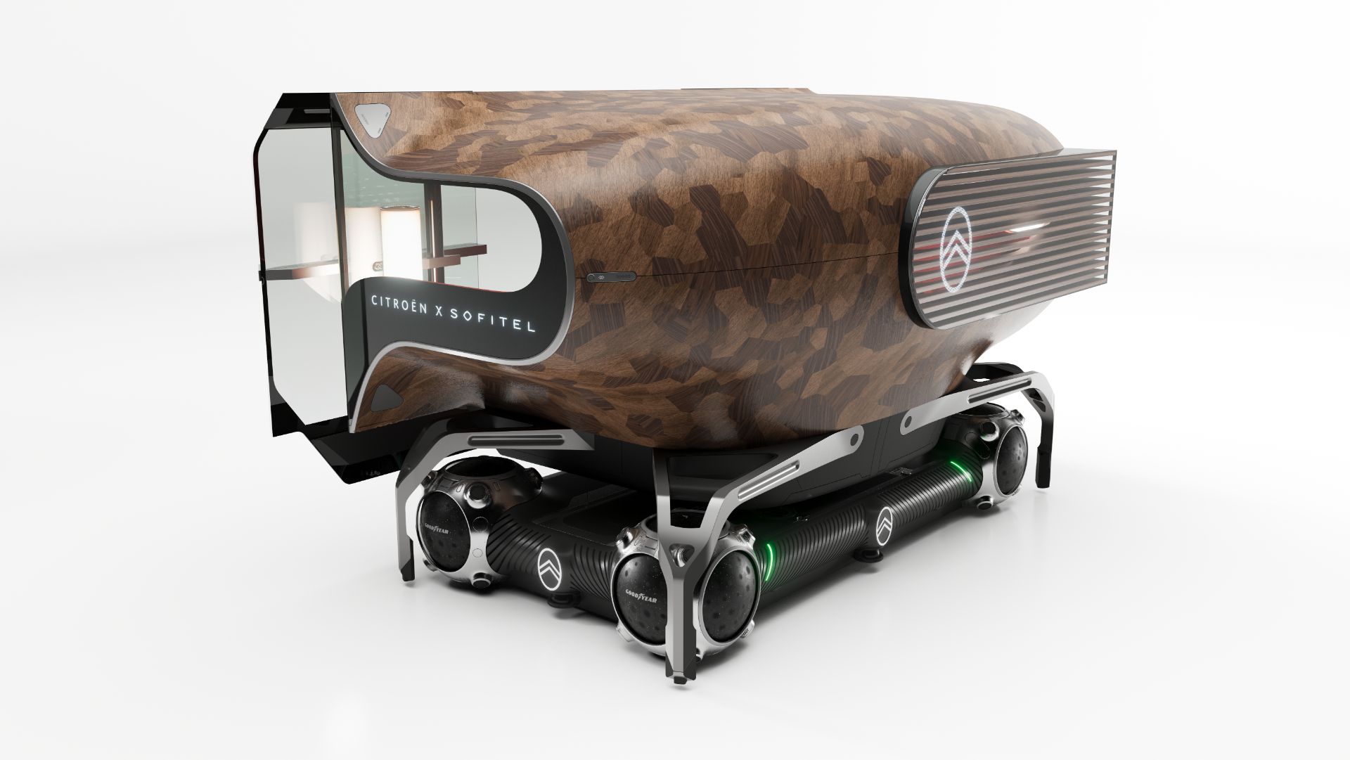 The Sofitel En Voyage pod, named after the famous hotels, has a wood marquetry exterior with large glass surfaces and automatic glazed sliding doors. The blood orange velvet interior can accommodate two or three passengers with a separate luggage compartment, mood lighting, an LED strip broadcasting the news, a bar that opens “like a flower”, a premium sound system, wireless charging pods and a touchscreen tablet.