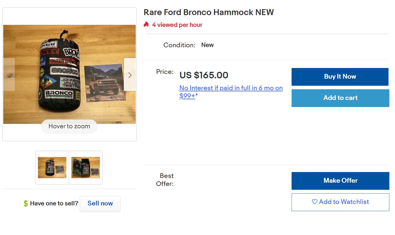 The hammock comes in a fun carrying bag covered in Bronco-related logos for things like the G.O.A.T. mode, the Outer Banks, and more. It should therefore make a nice memento for any Bronco owner, not just the reservations holders who are the only people getting them. That might explain why so many of these have already ended up on eBay with prices ranging from $50 to $200.
