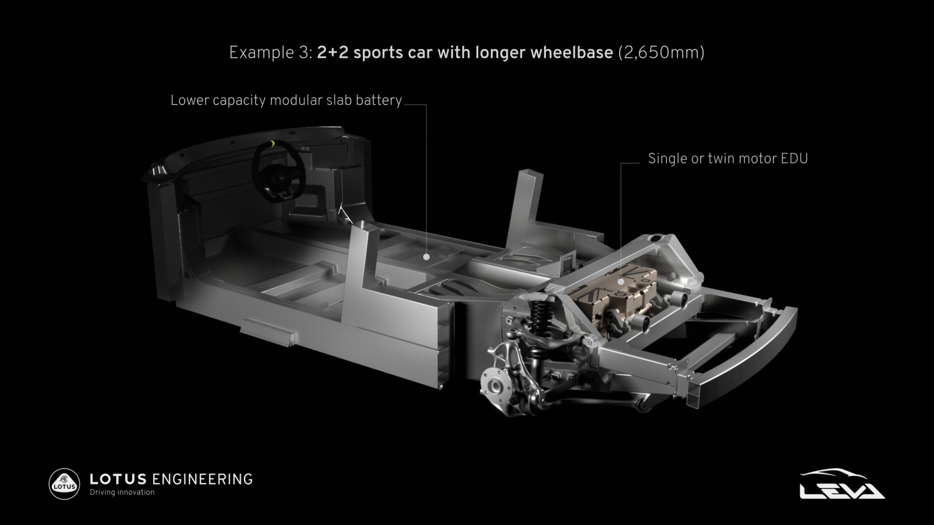 The electric architecture was developed through Project LEVA and it is 37% lighter compared to that of the Emira V6. At the same time, it supports multiple layouts for the e-motors, different battery capacities, and wheelbase lengths. This is made possible thanks to the multiple interchangeable components of the die-cast rear subframe.
