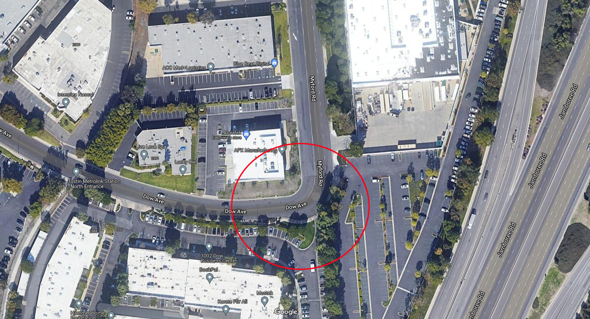 It appears as though the driver of the R1T prototype completed missed the right-hand turn onto Dow Avenue and ran straight up the curb, skidded across an area of grass, crashed through a bush, and then slammed into a parked Ford Explorer and Mercedes-Benz S-Class.