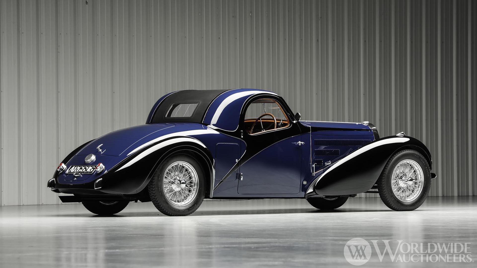 When it goes up at auction on Labor Day weekend, this blue and black 1938 Bugatti Type 57C Atalante Coupe will be of as much interest to art collectors as it is to car enthusiasts.